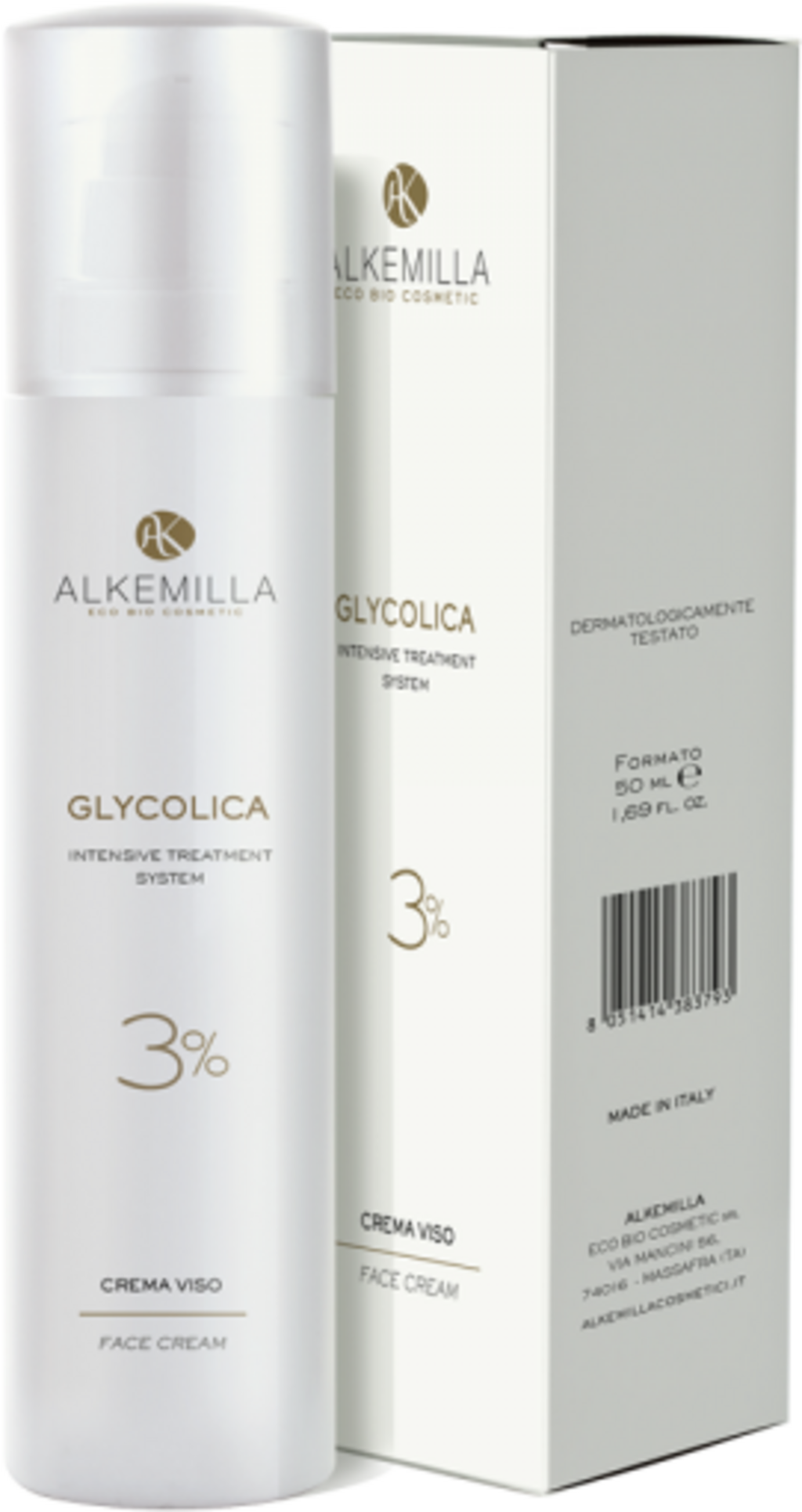 Denne ansiktskremen med 3% glykolsyre er en del av Glycolica Anti-Aging-linjen fra Alkemilla. Hovedingrediensen stimulerer produksjonen av elastin og kollagen, og har en eksfolierende effekt på huden. Kremen inneholder også koffein, som virker stimulerende på huden, samt regenerasjonsfremmende planteskvalan. I tillegg til fuktighetsgivende ingredienser som solsikke-, linfrø-, aloe vera- og mandel-ekstrakter, inneholder den også Alpha-Hydroxy-syre (AHA) fra frukt, som gir en strålende hudtone.