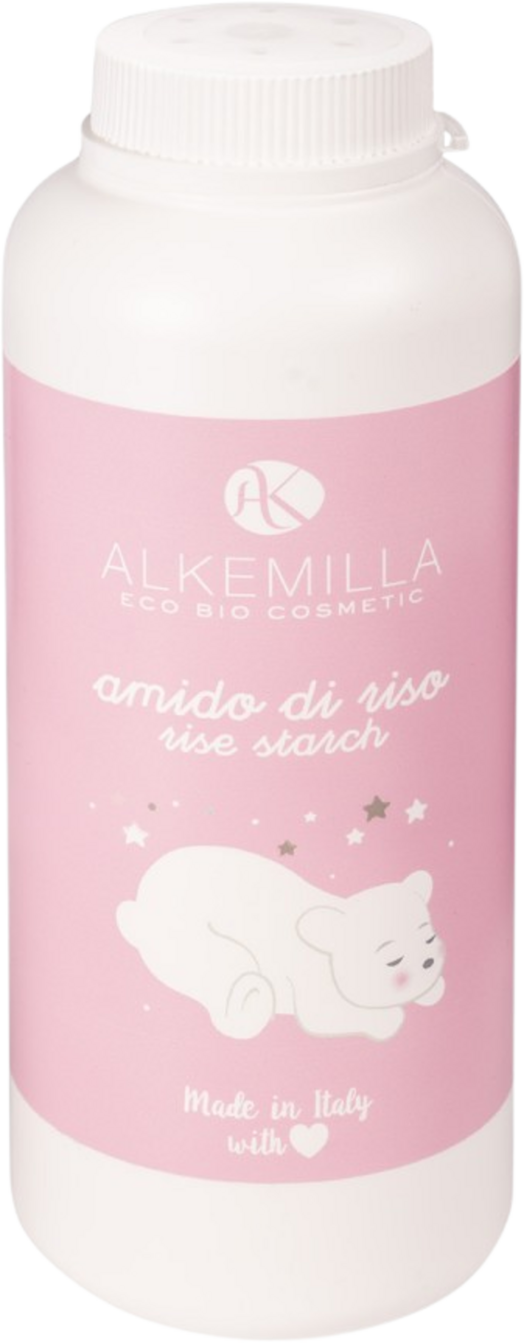 Den økologiske risstivelsen fra Alkemilla er beriket med solsikkeolje og ekstrakter fra kattost og kamille. Den kan brukes i stedet for såpe ved bading, ettersom den renser huden skånsomt, mykgjør og etterlater den ren. Produktet kan også brukes direkte på huden som et alternativ til pudder, og med sine lindrende egenskaper og absorberingsevne er det optimalt for bleiepleie.
