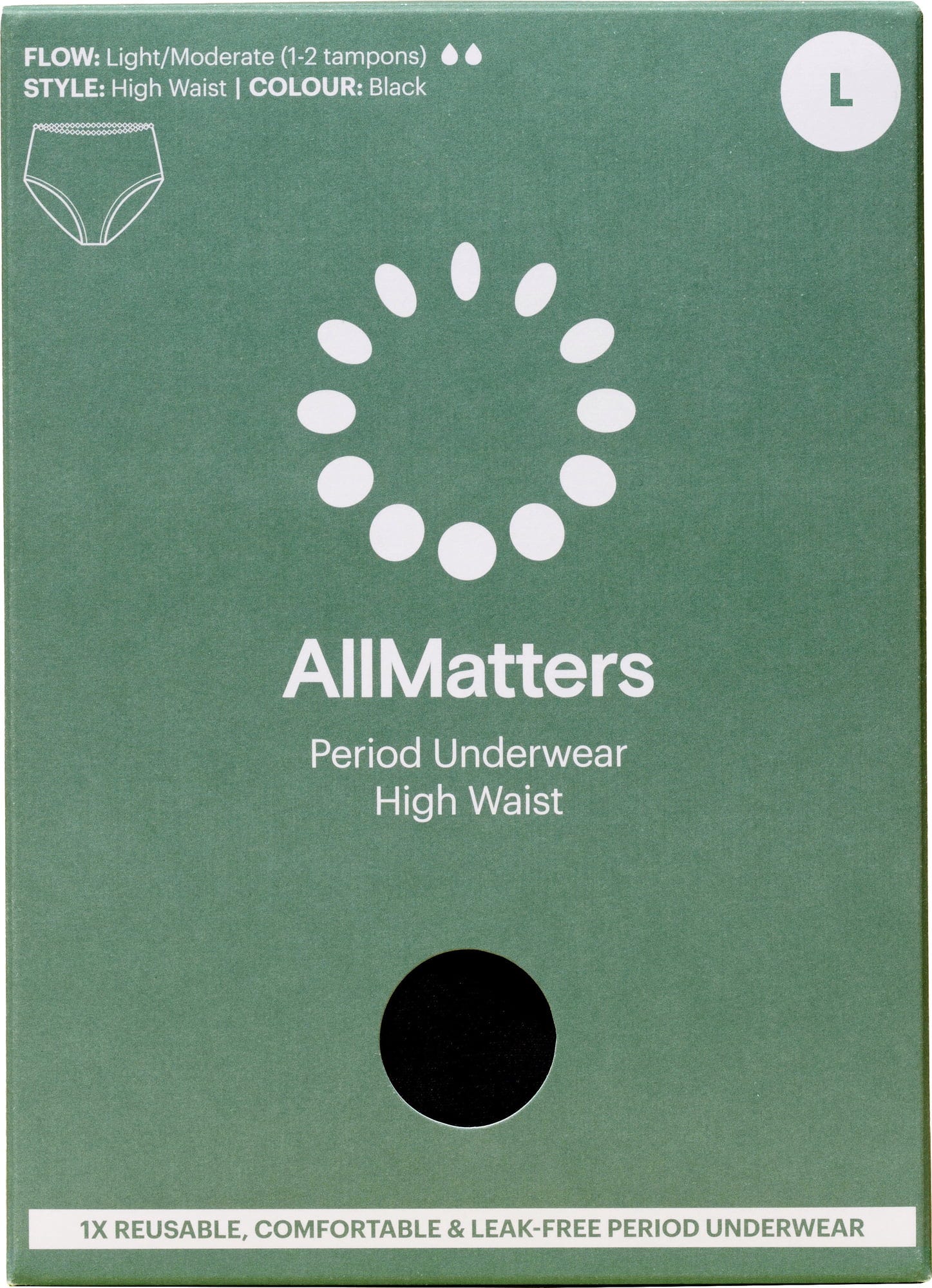 Periodetrusen med høy midje fra AllMatters er et gjenbrukbart, komfortabelt og lekkasjefritt alternativ til tradisjonelle menstruasjonsprodukter, med et smigrende snitt. Den har høy skjæring ved bena, høy midje og blondekant i livet, som gjør den ekstra behagelig. Trusen føles som vanlig undertøy, men har innebygde lag som har ulike funksjoner: De absorberer blødningen din, holder deg både tørr og luktfri, og sikrer at klærne dine ikke får flekker. Du kan bruke periodetrusen istedenfor bind, tamponger eller kopp – både dagtid og om natten. Eller du kan bruke den som ekstra beskyttelse sammen med koppen på de sterke dagene.