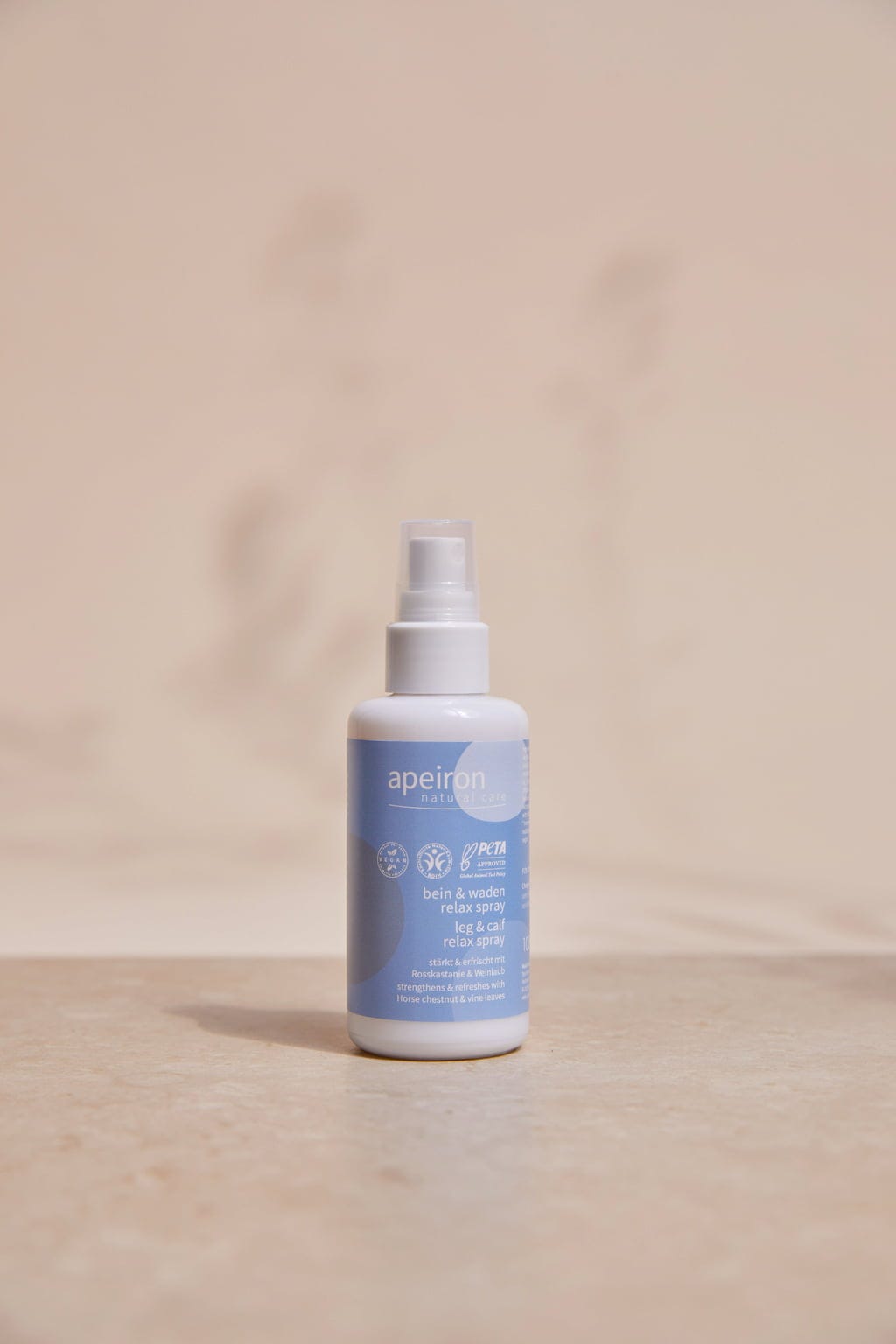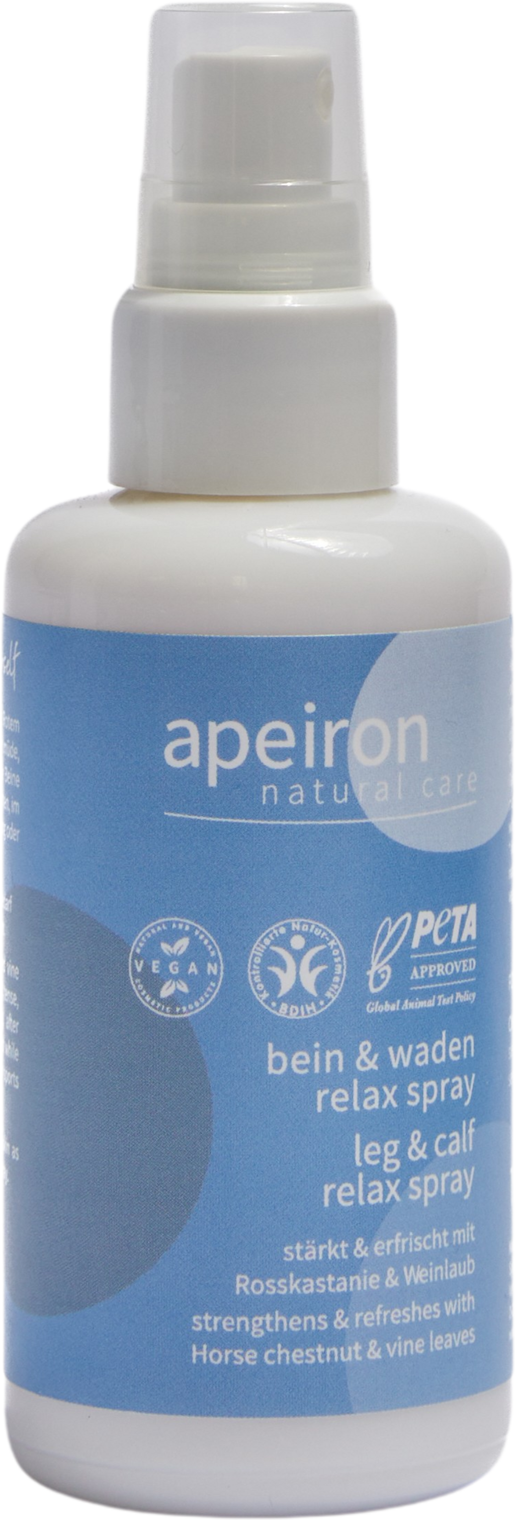 Ben- og leggsprayen fra apeiron pleier og lindrer slitne, hovne og belastede ben, samt føtter. Uansett om det er etter lengre tids sittende eller stående stilling, på jobb eller på farten, ved fysisk eller sportslig aktivitet, hjelper de nøye utvalgte ekstraktene av hestekastanje, rød vintre og arnika med å lindre, oppkvikke og friske opp bena. Samtidig sørger eteriske oljer fra salvie, sitrongress og ingefær for en kjølende effekt, som i tillegg til pleievirkningen reduserer følelsen av tyngde i bena.