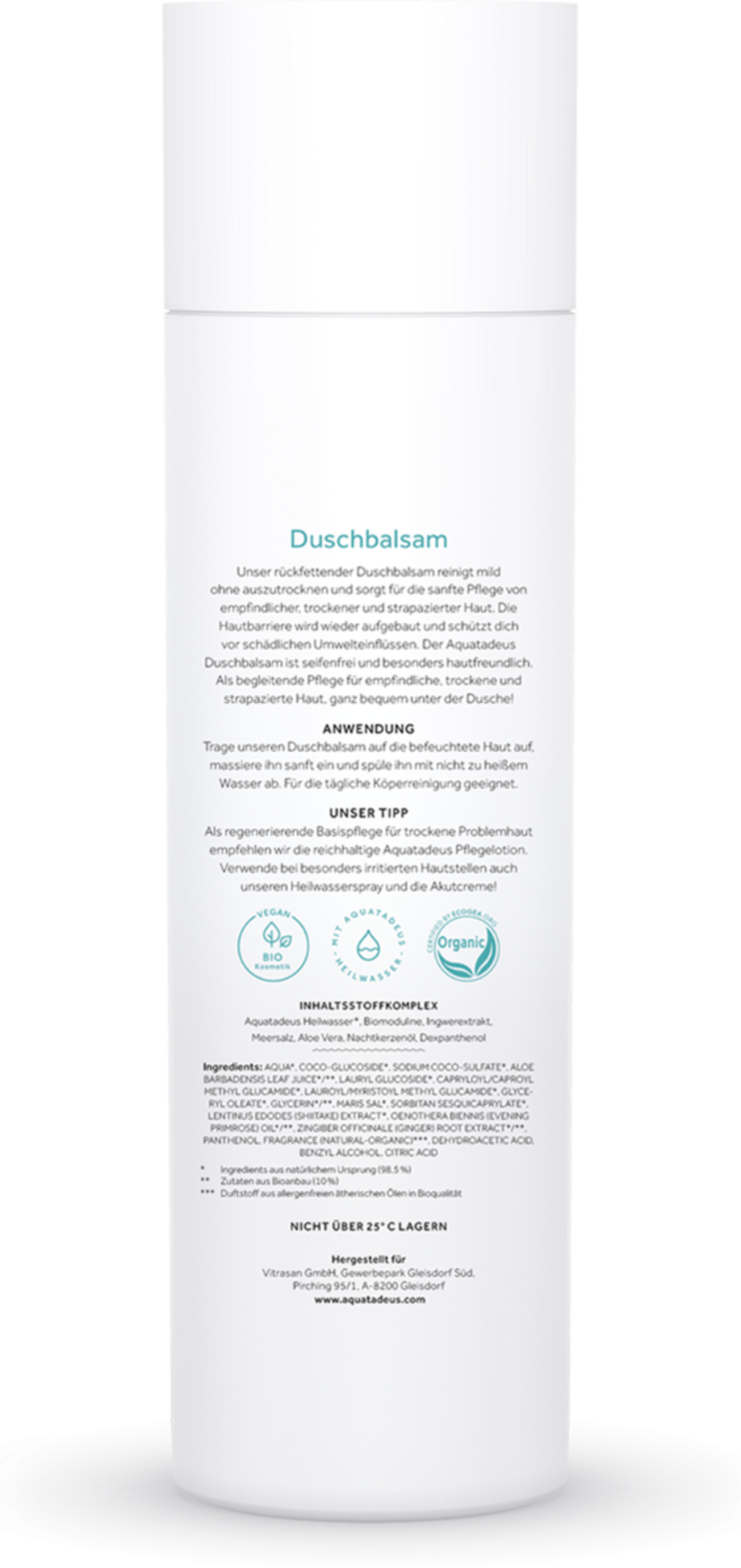 Med denne dusjbalsamen fra Aquatadeus er det slutt på følelsen av tørrhet etter dusjing. Den tilfører huden fuktighet under rengjøring, etterlater huden myk og er spesielt mild takket være sin hudvennlige pH-verdi.