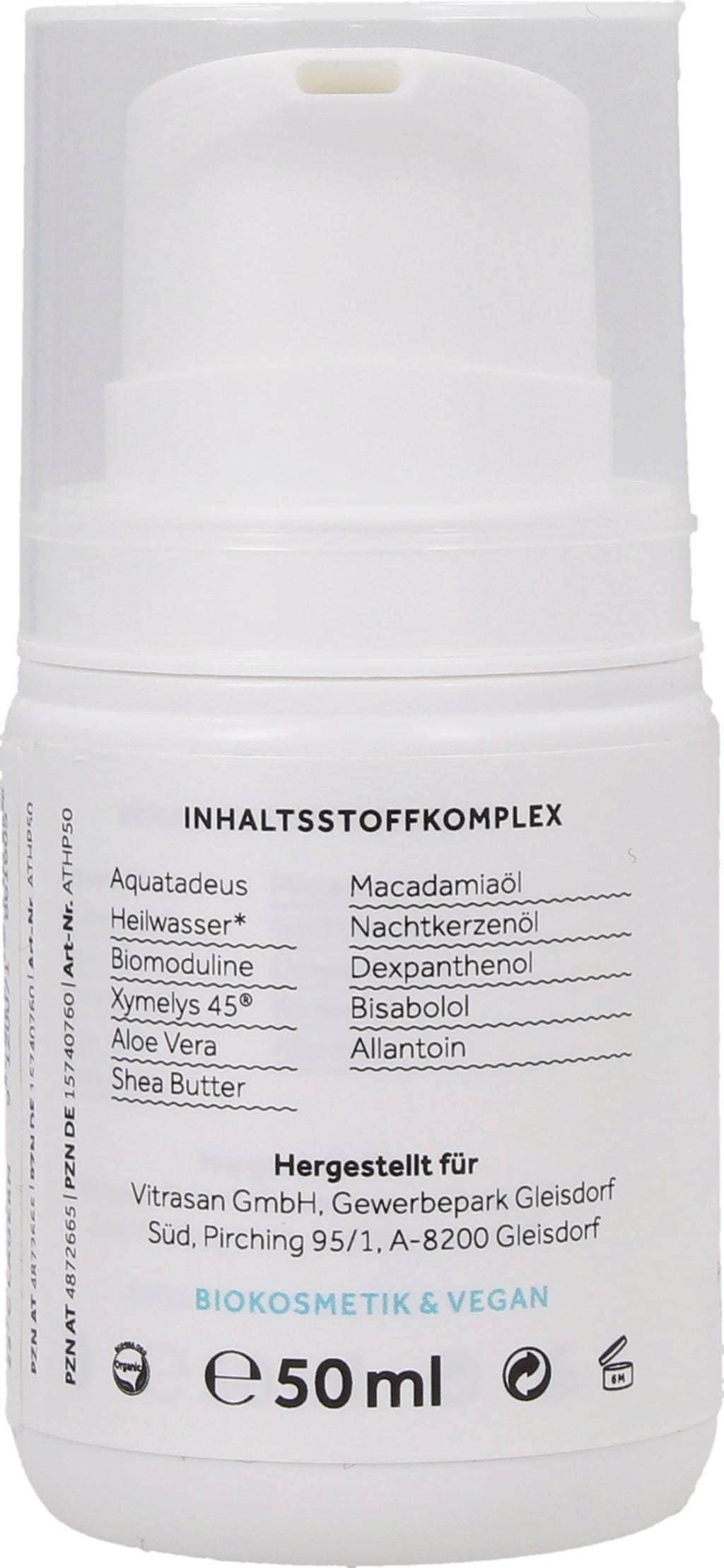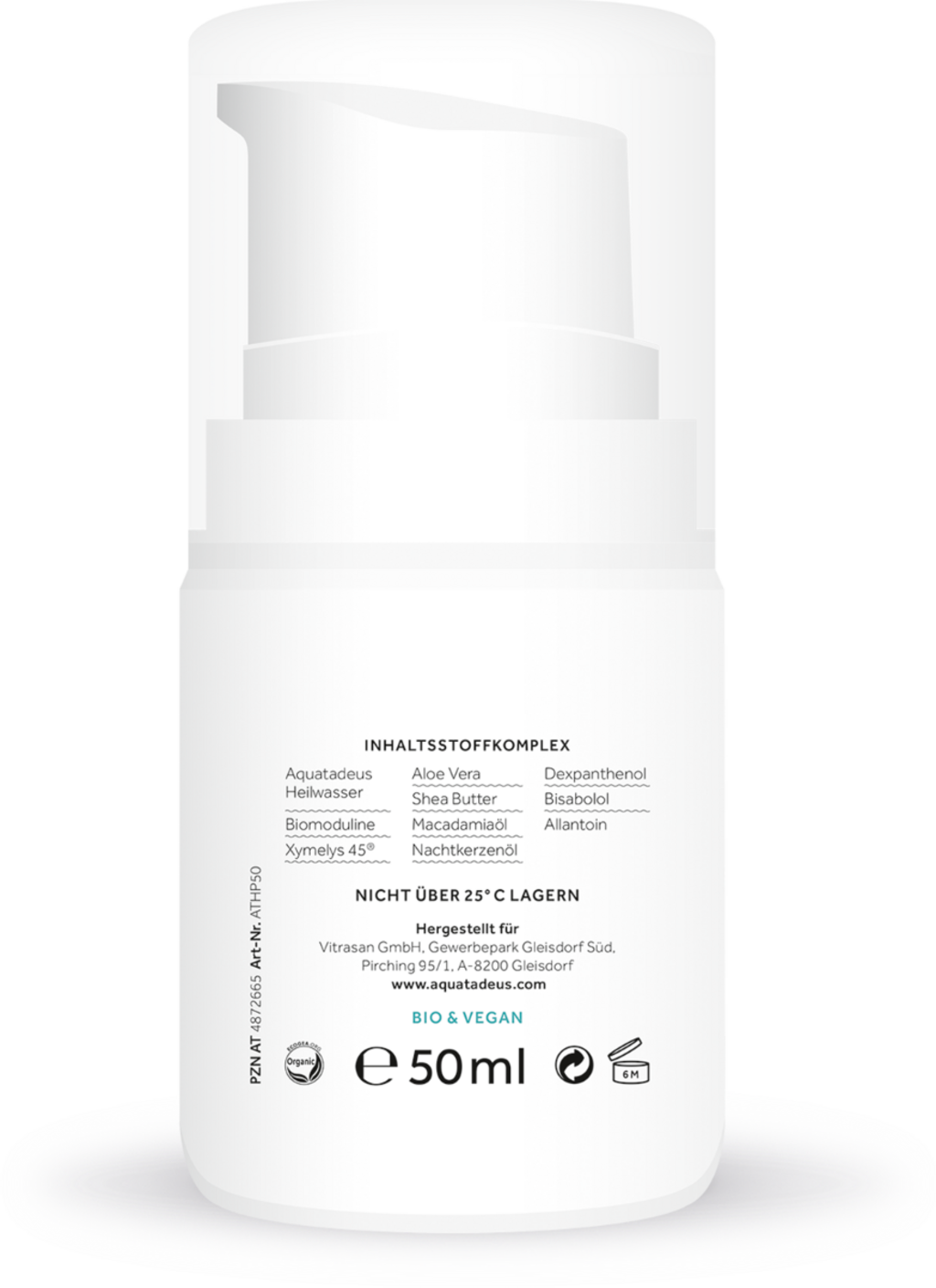 Denne håndkremen inneholder en naturlig ingredienskombinasjon med intensivt fuktighetsgivende og beskyttende egenskaper. Formuleringen av Aquatadeus helsevann, sheasmør, macadamiaolje, nattlysolje, Aloe Vera samt Dexpanthenol er den ideelle pleien for svært tørr, irritert hud.