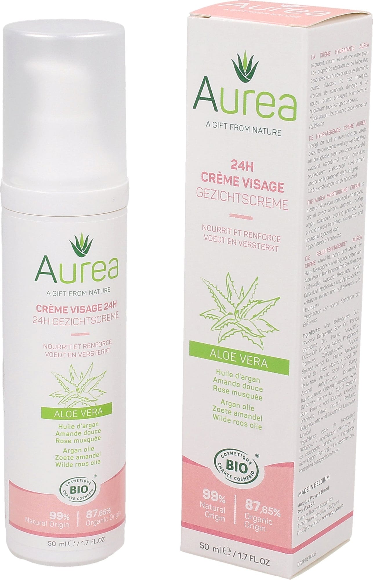 Den naturlige og fuktighetsgivende Aurea 24t ansiktskrem nærer og styrker huden, og etterlater den myk og smidig. Dens hypoallergene formel med pleiende oljer fra avokado, nype og søtmandel samt Aloe Vera bidrar til å motvirke dannelsen av rynker og gir langvarig fuktighet til huden.