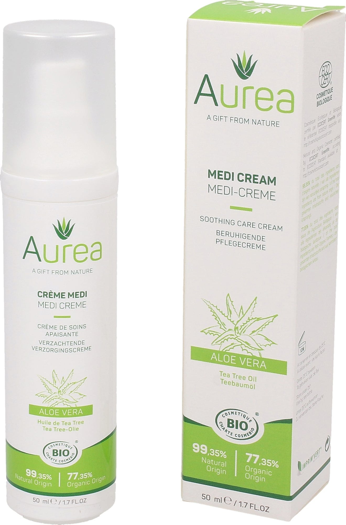 I Aurea Medi Cream kombineres de naturlige virkestoffene fra Aloe Vera og Tea Tree-olje til en rik og effektiv pleie for krevende hud. Aloe Vera skjemmer bort, nærer og fukter huden med vitaminer og mineraler.