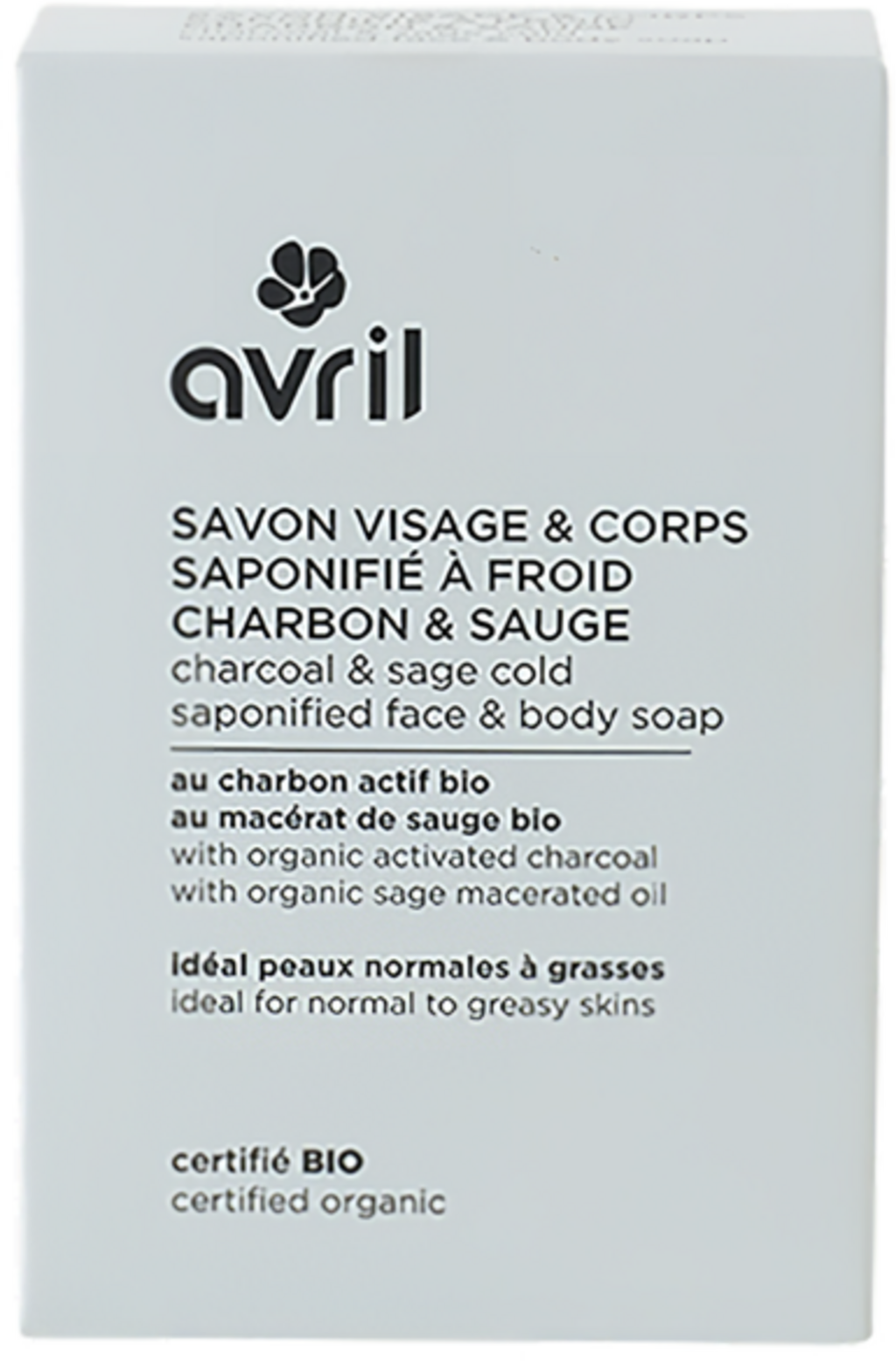 Avril Kaldsaponifisert ansikts- og kroppssåpe med kull og salvie, Charcoal & Sage (100 g)