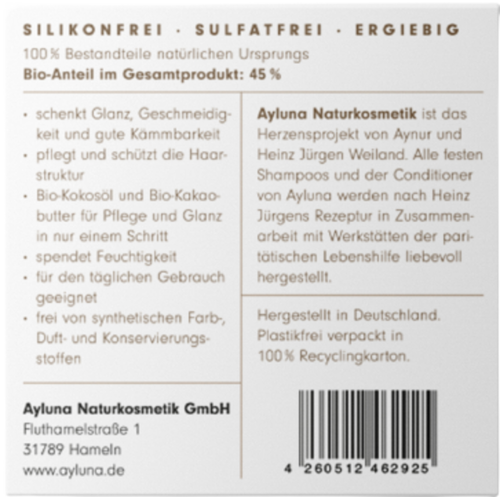 Med denne faste balsamen blir håret naturlig glansfullt og mykt. Økologisk kokosolje og økologisk kakaosmør pleier håret intensivt og gjør det lett å gre. En plantebasert vokskjerne forbedrer balsamens virkning ytterligere. Den praktiske, faste formen samt den enkle bruken gjør balsamen perfekt for reisende. Den er pakket i 100 % resirkulerbar papp.