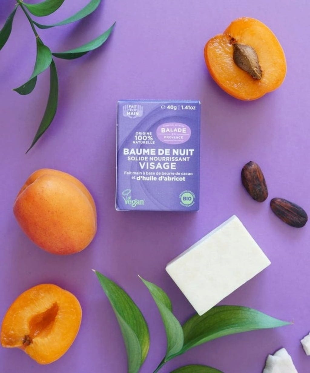 Med den faste nattbalsamen har BALADE EN PROVENCE skapt et mesterverk med et minimum av ingredienser. Disse er nøye utvalgte, effektive økologiske råstoffer som pleier intensivt. Formuleringen med kakaosmør, kokos- og aprikoskjerneolje samt carnaubavoks virker nærende og tilfører huden fuktighet gjennom natten. For ny glød ved oppvåkning.
