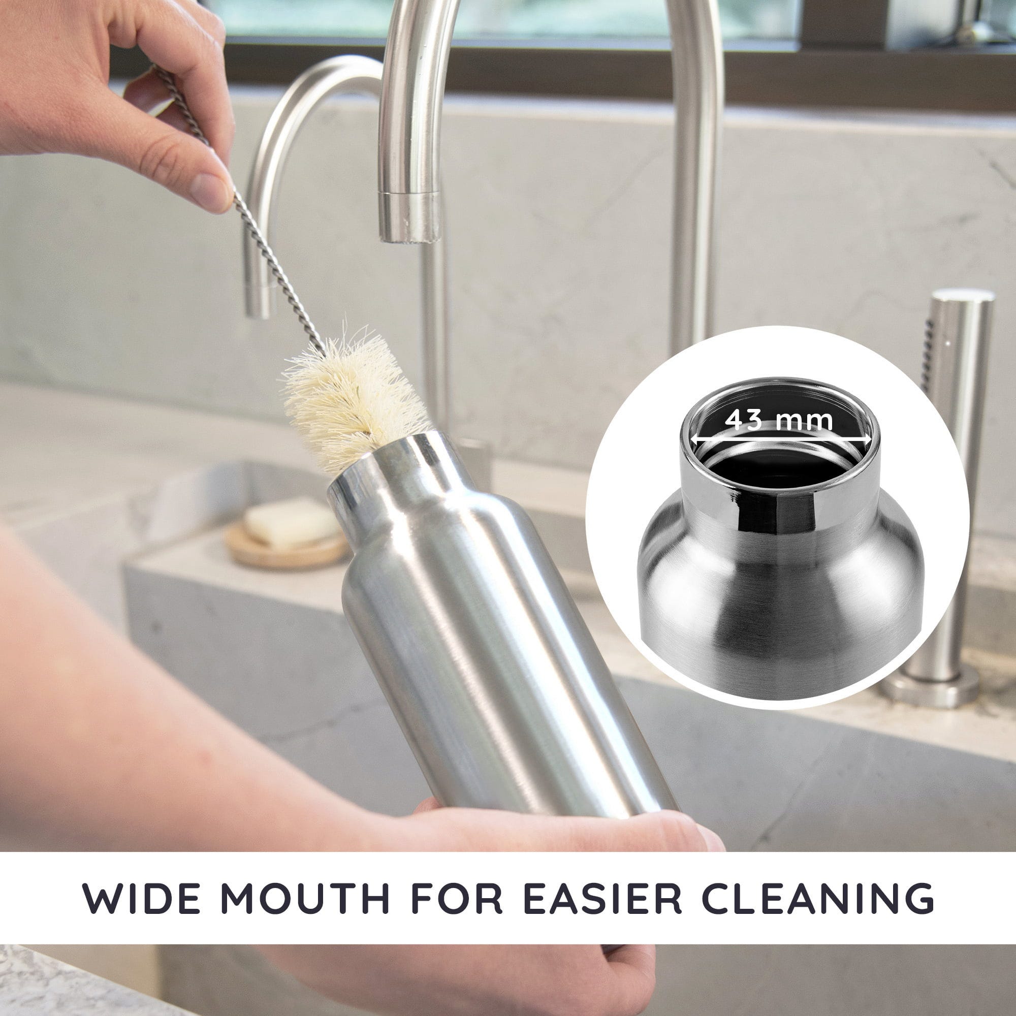 Med denne termosflasken av rustfritt stål har du den perfekte følgesvennen for enhver anledning! Den holder kalde drikker kjølige og varme drikker varme. Åpningen er stor nok til at isbiter, en teball eller frukt også kan få plass. I tillegg kan flasken enkelt rengjøres med en børste.
