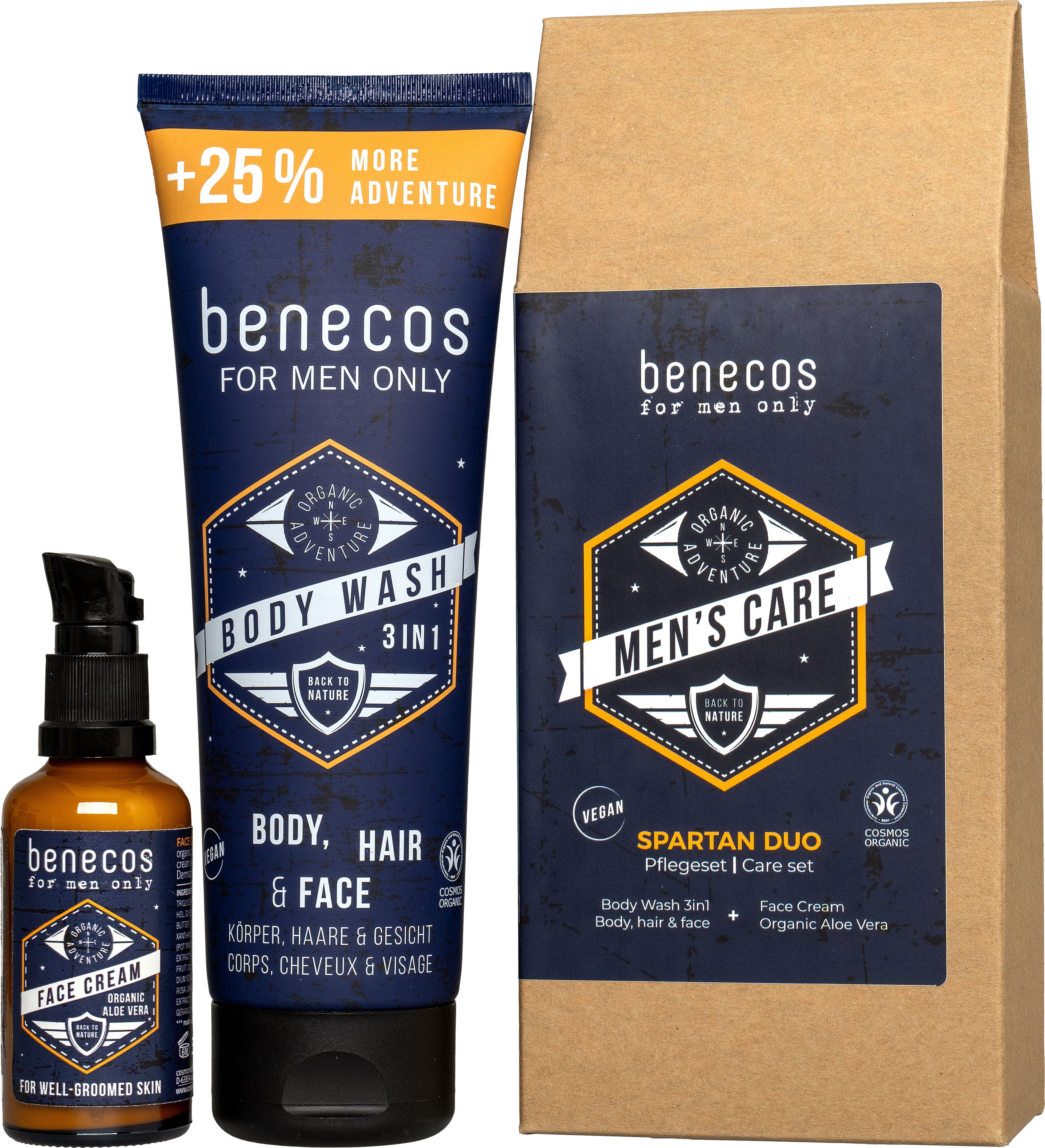 "Spartan Duo" gavesett inneholder to pleieprodukter for ham: 3in1 Body Wash fungerer som et multitalent for kropp, (skjegg)hår og ansikt for den ultimate friskhetsfølelsen, mens ansiktskremen trekker raskt inn og pleier huden – for en behagelig myk følelse. To produkter, komplett pleie og ferdig som gave.