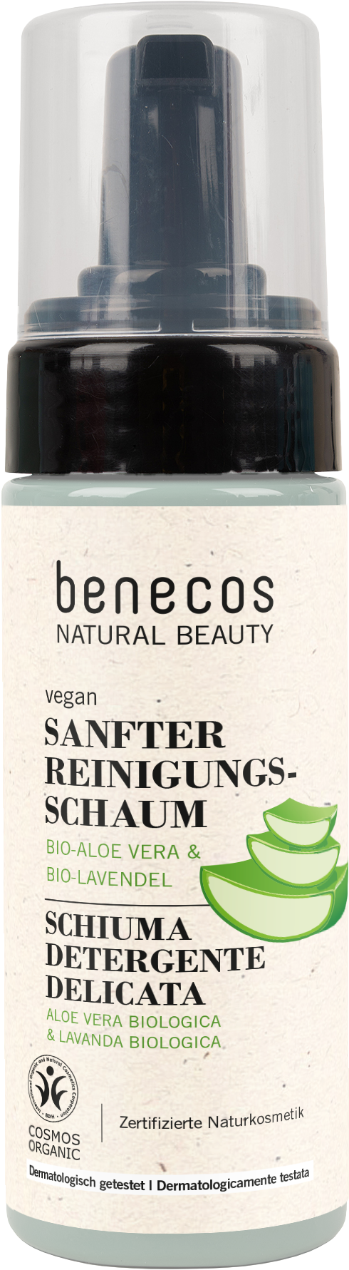 Med den skånsomme renseskummen kan normale hudtyper rengjøres mildt. Den fjerner sminke pålitelig, frisker opp og gir huden fuktighet med økologisk aloe vera og lavendelvann.