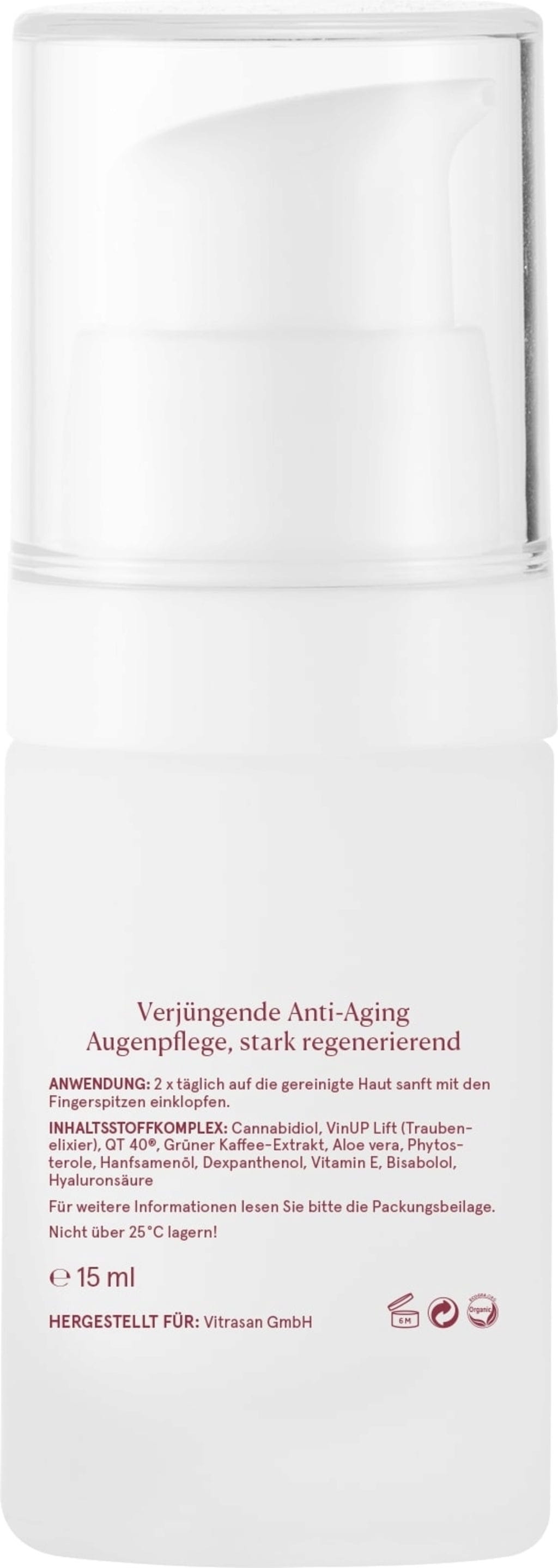 Denne kremen gir en naturlig strålende øyeparti. Ingredienskombinasjonen av provitamin A, bisabolol, hyaluronsyre og hampfrøolje gir intens fuktighet og næring. Den anti-aldrende effekten bidrar til å styrke hudens elastisitet og redusere tørrhetslinjer.