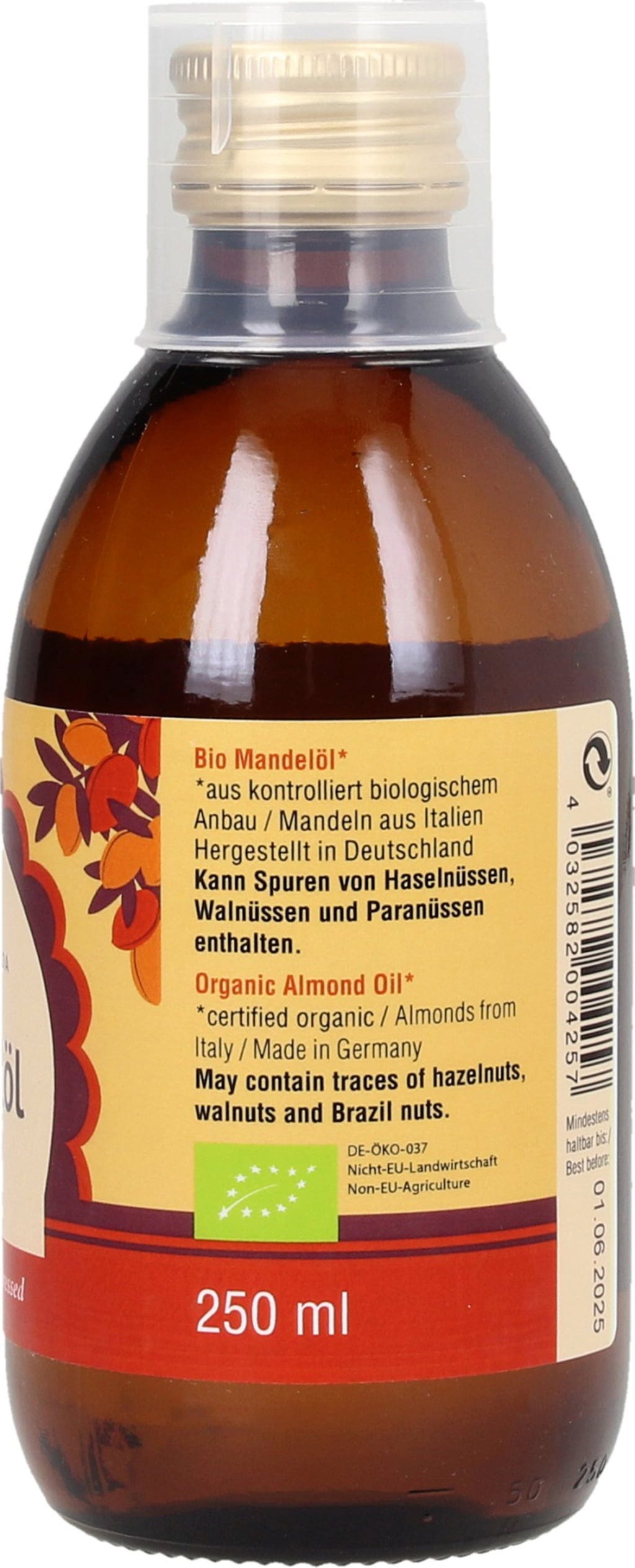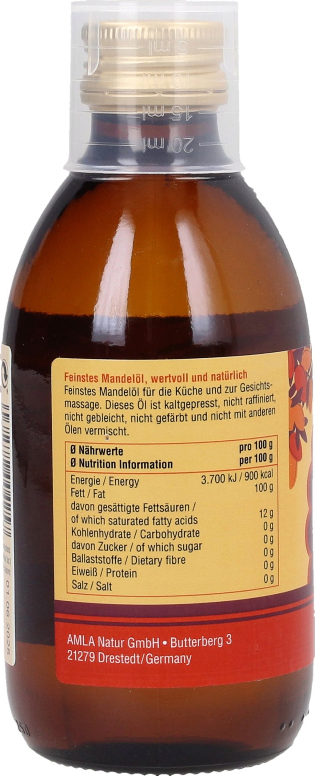 Fineste mandelolje fra kontrollerte økologiske avlinger, egnet for matlaging og ansiktsmassasje. Denne oljen er kaldpresset, uraffinert, ubleket, ufarget og ikke blandet med andre oljer. Den mørke glassflasken bevarer kvaliteten på de kostbare ingrediensene. Den har en meget fin, lett søtlig og nøtteaktig smak.
