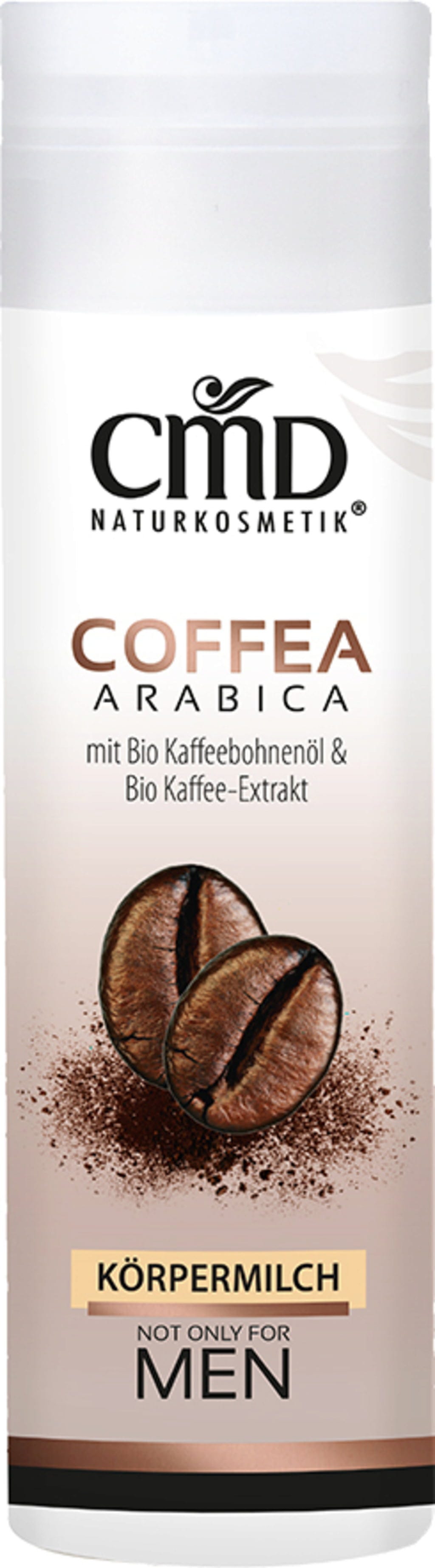 Kroppsmelken fra CMDs Coffea Arabica-linje for menn inneholder verdifull kaffebønneolje samt kaffeekstrakt fra ristede Arabica-kaffebønner fra kontrollert økologisk landbruk. Den omfavner både kropp og sanser med sin duft, mens den lette teksturen pleier intensivt, tilfører huden fuktighet, og etterlater den silkemyk. Den inneholder naturlig koffein, som virker aktiverende og får huden til å se strammere ut.