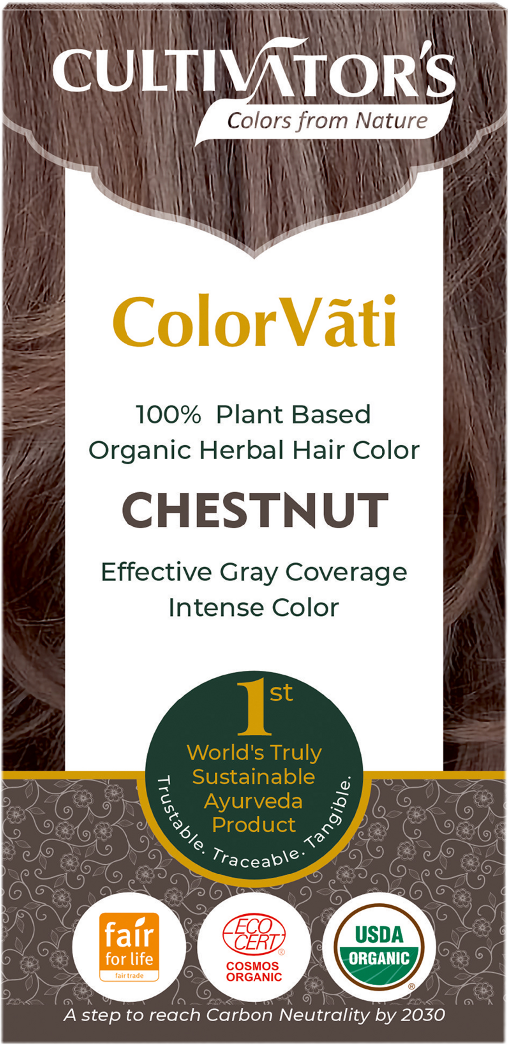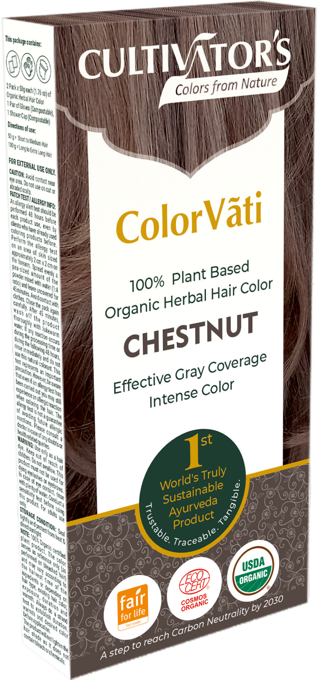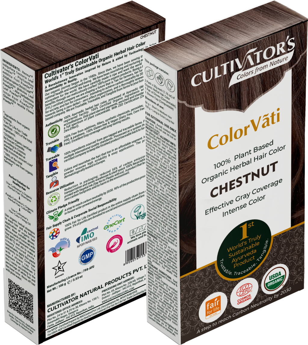 Fargen Chestnut består av utvalgte ayurvediske plantepulver som til sammen gir naturlig pene, kastanjebrune nyanser. Samtidig etterlater de håret velpleid, friskt og fyldig.