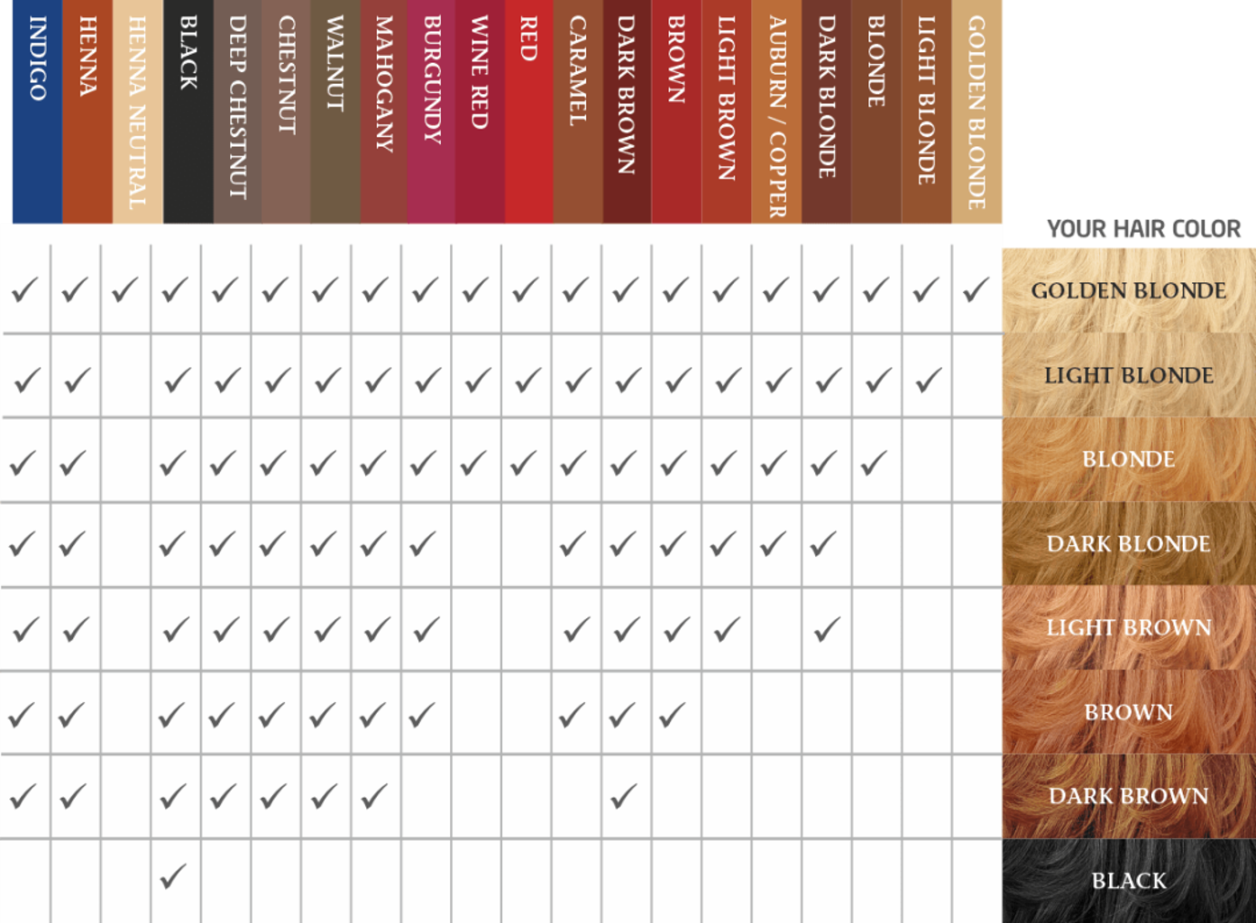 Henna, Indigofera Tinctoria (Indigo) Leaf Powder, Phyllanthus Emblica Fruit Powder, Ziziphus Spina-Christi Leaf, Eucalyptus Globulus Leaf Powder, Aloe Barbadensis Leaf Powder, Curcuma Longa (Turmeric) Root Extract, Chamomilla Recutita Flower Powder