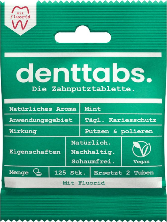De innovative DENTTABS tannpuss-tablettene er et effektivt alternativ til vanlig tannkrem. Takket være deres spesielle sammensetning blir tennene polert, og de gir ingen plass for plakk og misfarging å feste seg. Resultatet er glattere, renere og sunnere tenner. Videre remineraliserer fluoridet i DENTTABS tennene mer effektivt og målrettet enn fluoridholdig tannkrem. Og det beste av alt: en myk tannbørste er det perfekte verktøyet.