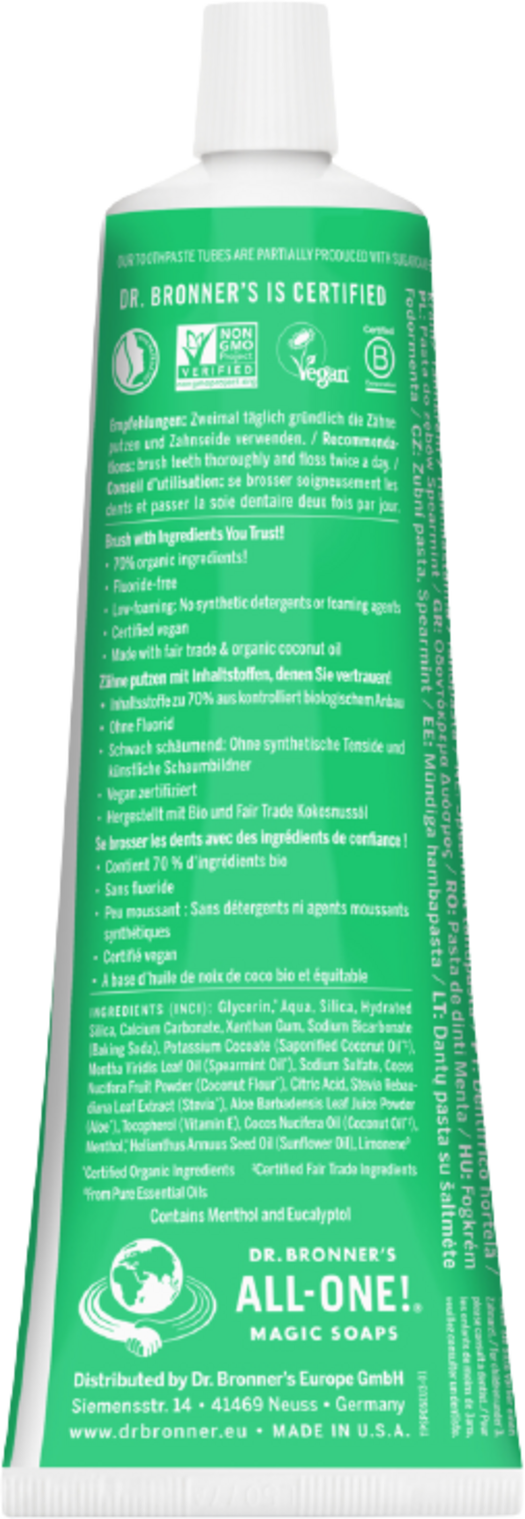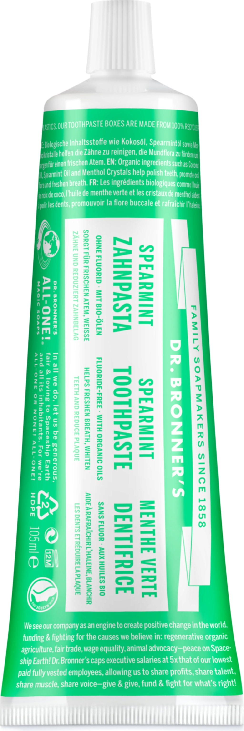 Enkel men effektiv, slik fungerer tannpuss med den fluorfrie tannkremen Spearmint fra Dr. Bronner's. Kiselsyre og kalsiumkarbonat polerer tennene skånsomt, mens natron og forspeilet økologisk kokosolje rengjør effektivt. Hele 70% av ingrediensene kommer fra kontrollert økologisk landbruk, og noen i tillegg fra Fair Trade-prosjekter. Tannkremen har en mild, mintsmak og gir en behagelig frisk munnfølelse.