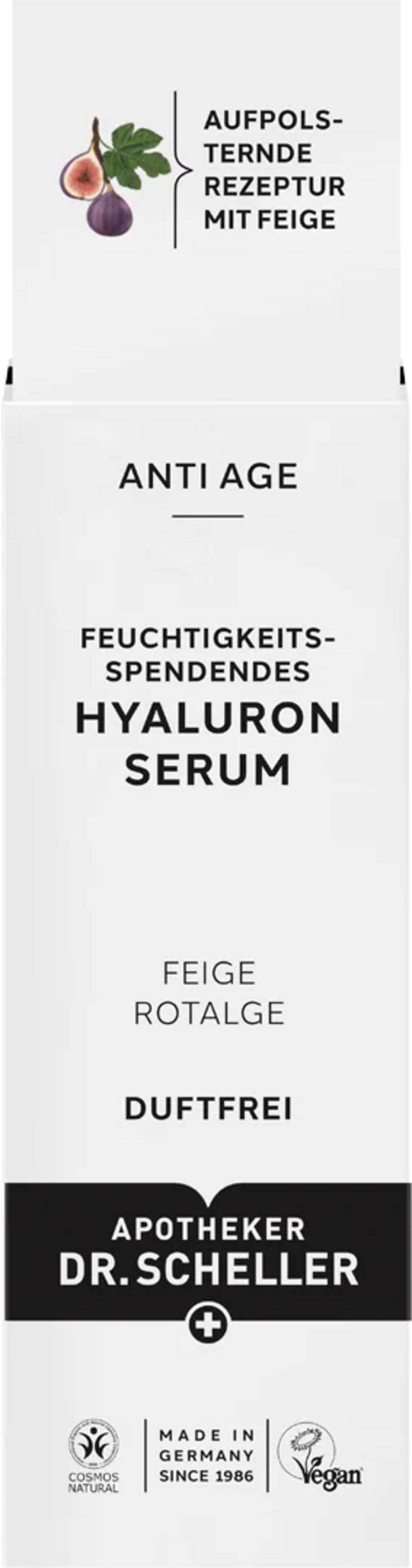 Serumet fra Dr. Scheller gir ideell hydrering for alle hudtyper med en verdifull kompleks av 2-fasett hyaluronsyre, rødalger og fiken, som fyller ut de første linjene. Samspillet mellom høymolekylær og lavmolekylær hyaluronsyre fungerer som en barriere som minimerer fuktighetstap og glatter huden. Den parfymefrie formuleringen er spesielt mild, og forbedrer hudens elastisitet og fasthet.
