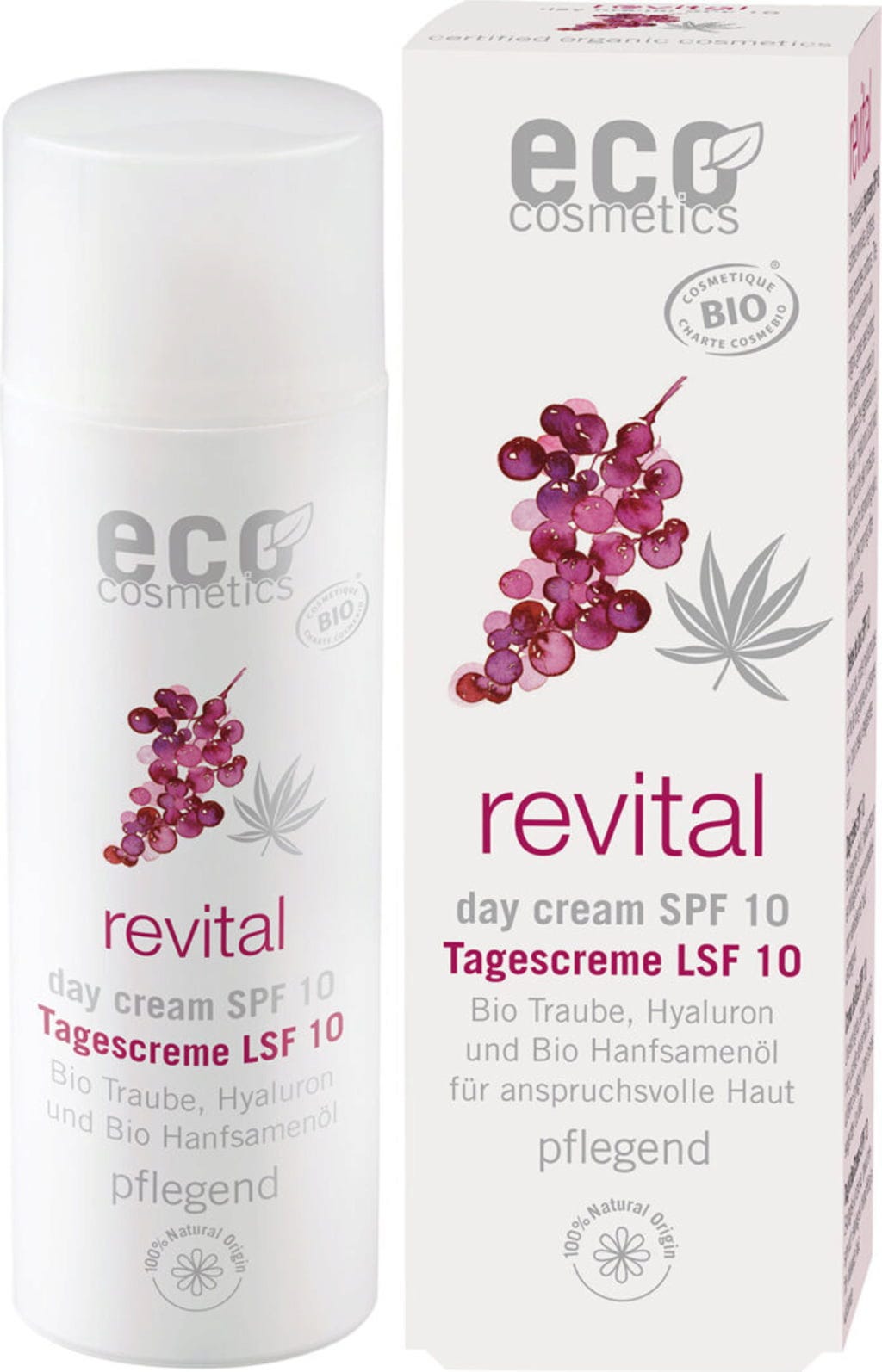 Den revitaliserende dagkremen med SPF10 fra eco cosmetics gir huden din mer fasthet og elastisitet. En kombinasjon av hyaluronsyre, økologisk hampfrøolje, Q10 og antioksidant OPC, som blir utvunnet fra økologisk druekjerneekstrakt, tilfører huden fuktighet og gir den en strålende glød. Den vidunderlige sammensetningen av diskrete og naturlige eteriske oljer sprer en behagelig duft og trollbinder sansene.