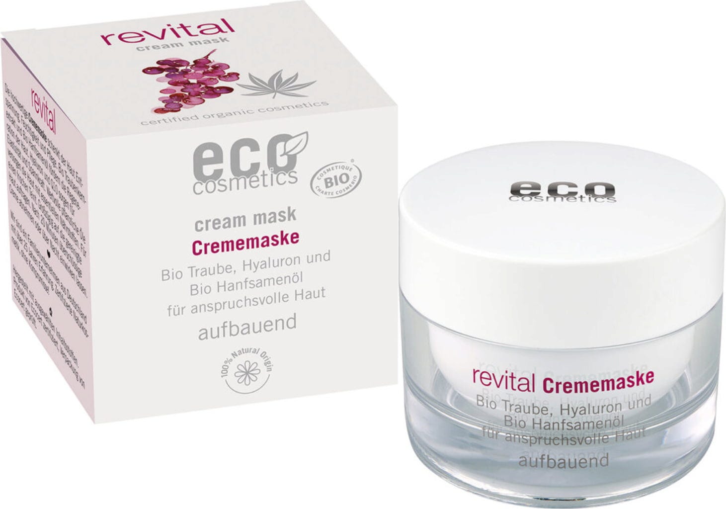 Den revitaliserende kremmasken fra eco cosmetics støtter hudens regenerering, gir mer spenst og elastisitet, og gir en frisk glød. OPC, hentet fra økologisk druekjerneekstrakt, er en effektiv antioksidant som gir positive egenskaper i hudpleien. Verdifulle økologiske shea- og mangofruktkjernesmør gir huden rikelig med fuktighet og holder den myk og smidig.