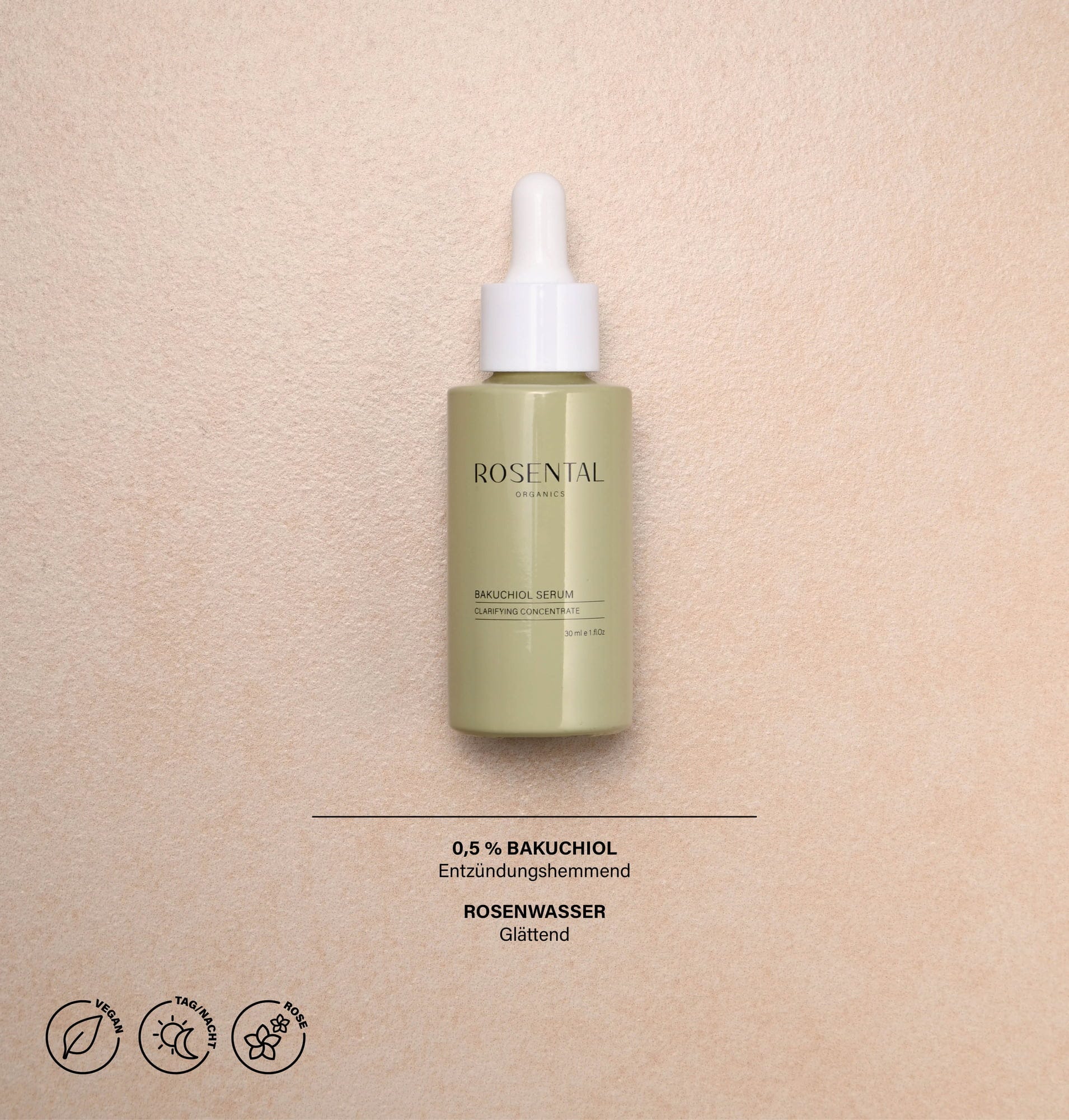 Serumet fra Rosental Organics inneholder den kraftfulle, naturlige ingrediensen bakuchiol, som er ideell for hudproblemer som urenheter, solskader og hyperpigmentering. Fine linjer og tidlige tegn på hudaldring glattes ut takket være det naturlige alternativet til retinol. Bakuchiol fremmer kollagenproduksjonen og gir dermed huden din fasthet.