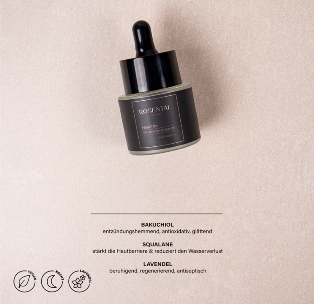 Denne lette nattoljen er perfekt for din kveldspleie, da den støtter opptaket av aktive stoffer fra produktene i din hudpleierutine. Den høykvalitets kombinasjonen av Bakuchiol og Squalan gir en silkemyk følelse uten å etterlate en fet film på huden. Formuleringen tilfører intensiv fuktighet og beskytter samtidig mot tap av vann. Takket være lavendelolje starter også en regenereringsprosess over natten, slik at du våkner med en styrket og vital følelse. Du blir også ledsaget av en balsamisk, urtekrydret duft som lar sinnet finne hvile.