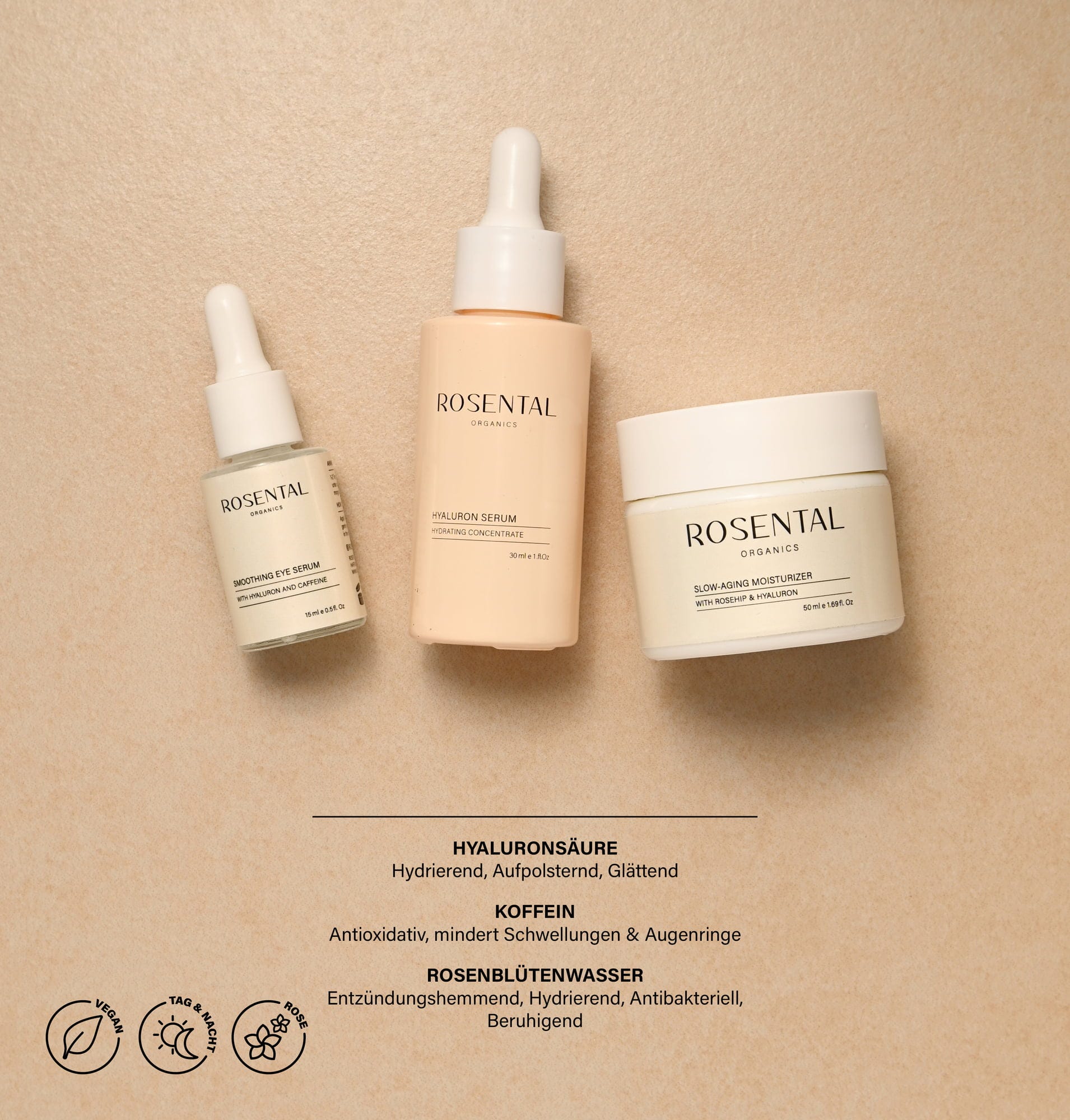 Dette settet består av tre kvalitetsprodukter: et øyeserum, et hyaluronsyreserum og en fuktighetskrem. Alle produktene er utviklet med høykvalitets hyaluron for å gi fuktighet og fylle huden fra innsiden. Sammen utgjør de en optimal hudpleierutine for en frisk og velpleid hud.