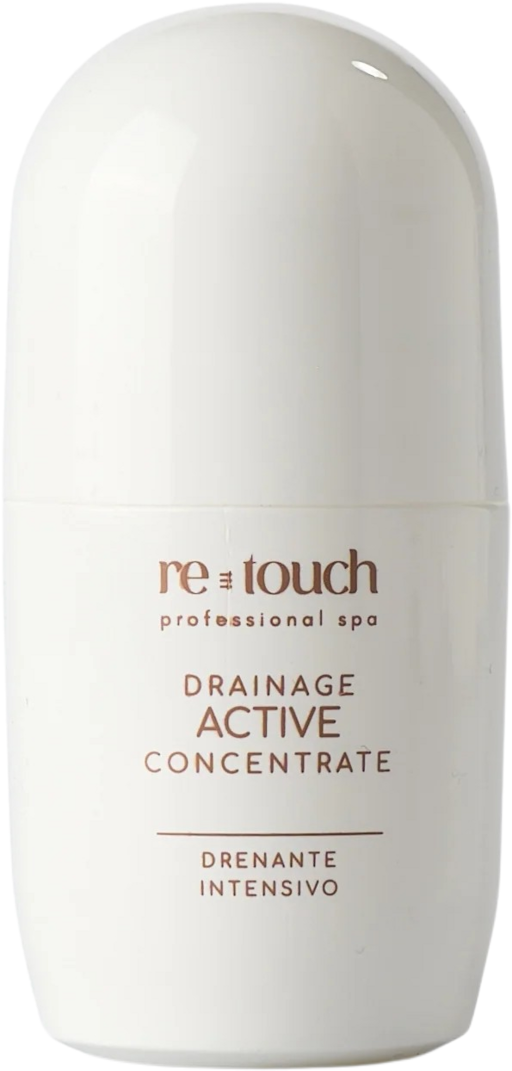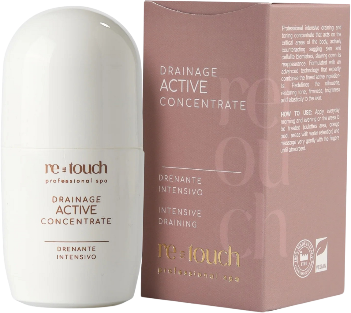 Re-touch Drainage Active Concentrate er en konsentrert intensivpleie utviklet spesielt for kroppskonturering. Formuleringen kombinerer utvalgte ekstrakter for å gi optimal pleie ved cellulitter og en forfriskende følelse. Dette gir huden ny glød og fasthet, sammen med hydrering for forbedret elastisitet og fasthet.