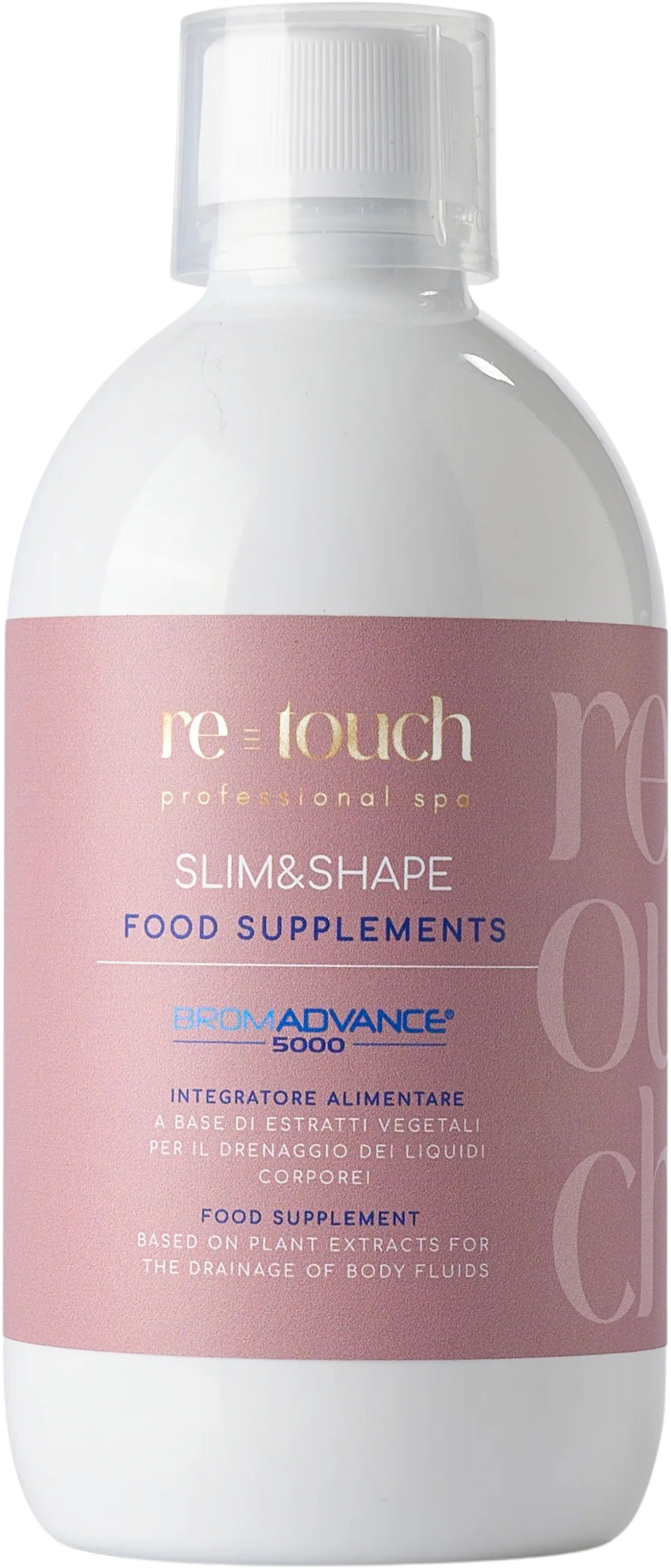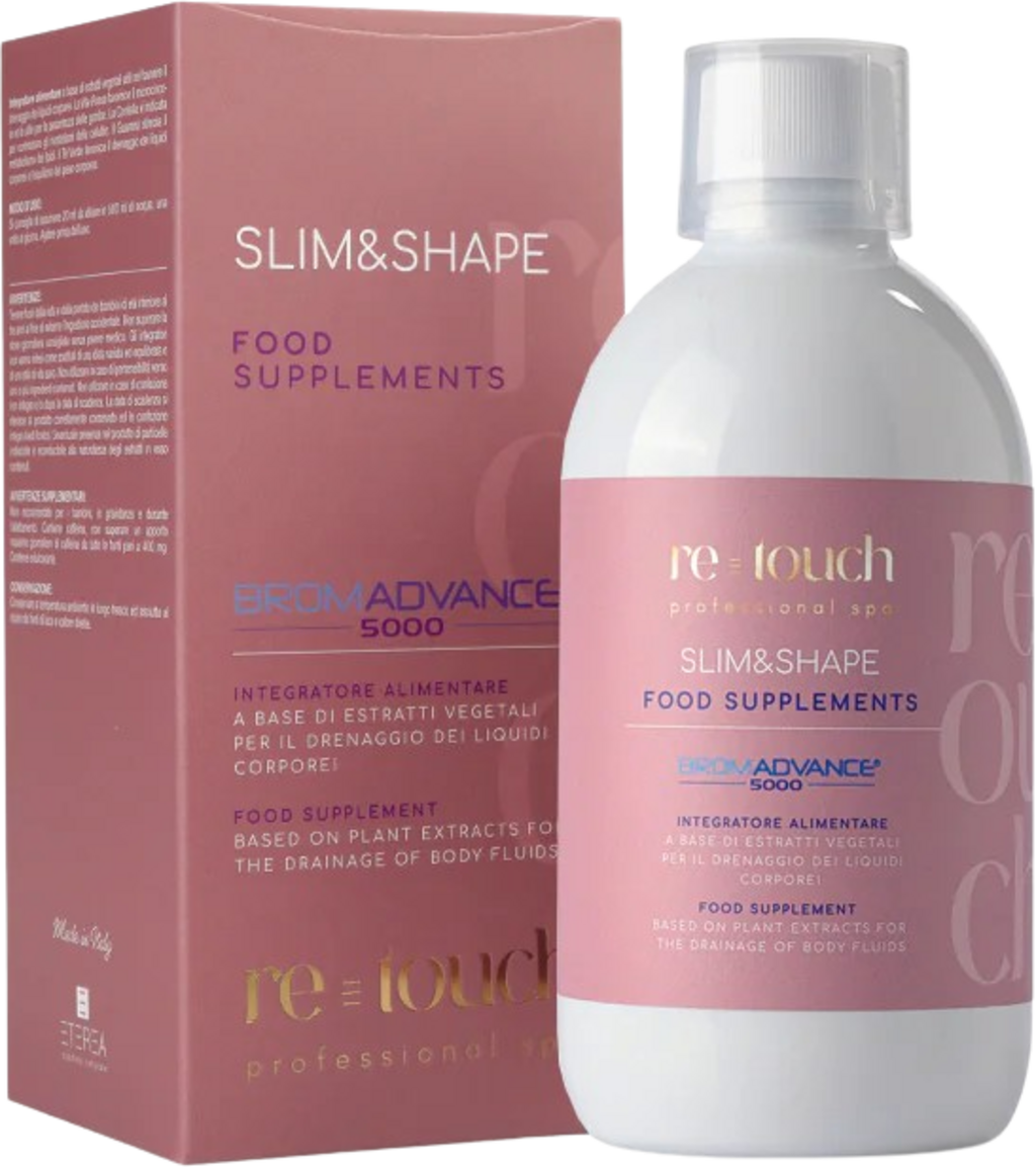 SLIM & SHAPE fra re-touch-serien er et kosttilskudd basert på nøye utvalgte planteekstrakter som et tillegg til cellulittpleie. Det inneholder ekstrakter fra rødvin, centella, grønn te og guarana.