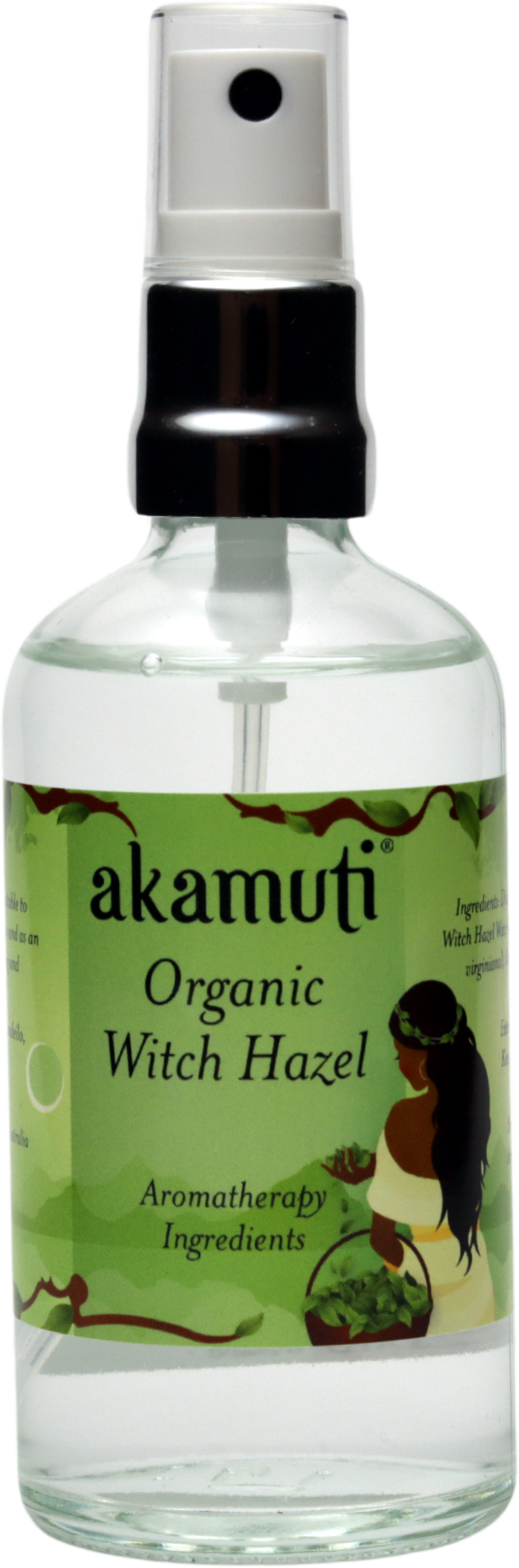 Merk: Akamuti beklager at det ikke lenger er mulig å finne en leverandør av alkoholfritt trollhasselvann, og ber om forståelse for dette! På grunn av lovmessige endringer blir det stadig vanskeligere å finne blomstervann uten alkohol eller konserveringsmidler. Akamuti håper å kunne tilby de andre blomstervannene alkoholfritt fremover. Det påpekes at den brukte trollhasselen er fra sertifisert økologisk landbruk.