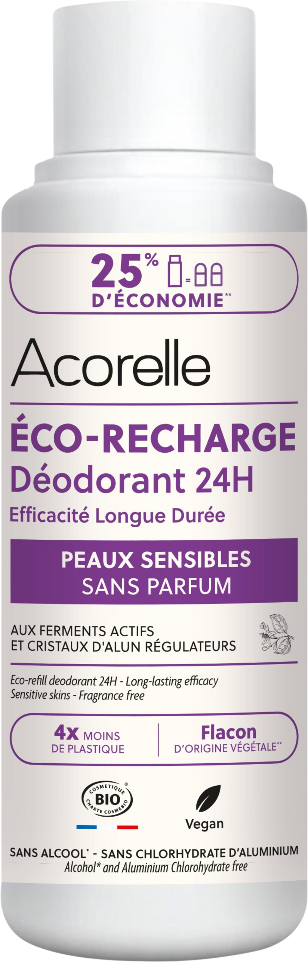 Med denne refill kan Acorelle’s Skånsomme Deo enkelt fylles på igjen, og slik bidra til å redusere plastavfall. Formuleringen er skreddersydd for behovene til sensitiv hud og beskytter naturlig mot ubehagelig lukt ved hjelp av alun.