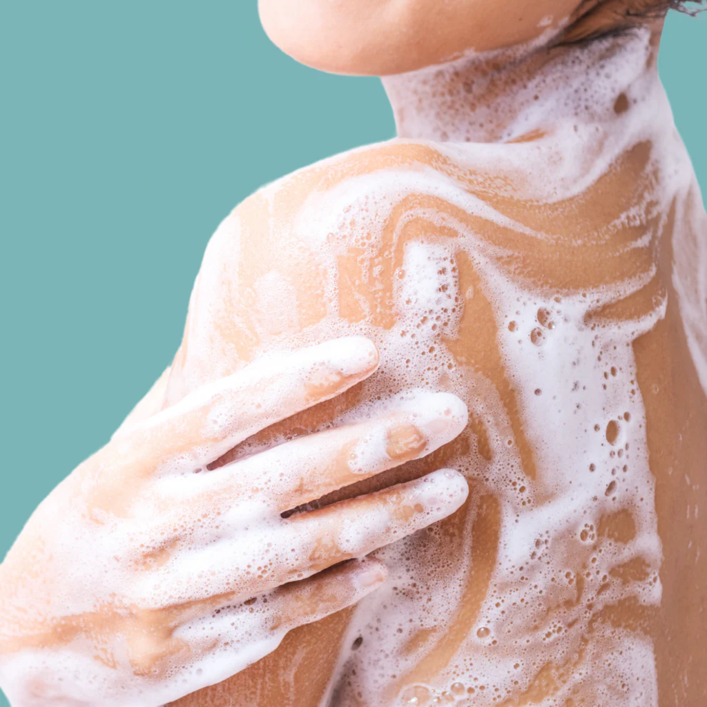- Pump dusjskummet i håndflatene og påfør det forsiktig i sirkulære bevegelser på huden.