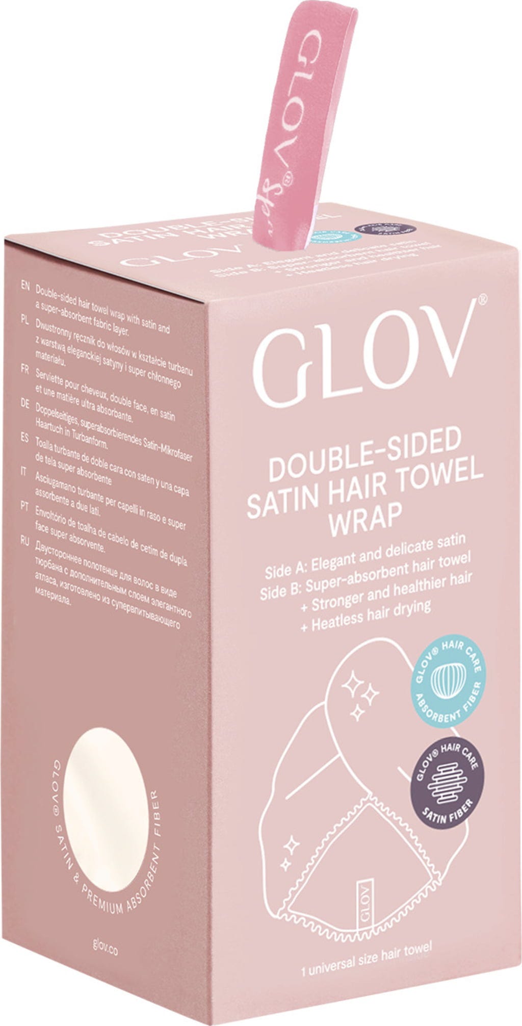 Den vendbare turbanen kan brukes på begge sider. Det superabsorberende GLOV®-mikrofibermaterialet absorberer fuktighet etter hårvask, mens den satengbelagte siden ser fantastisk ut. Når den glatte satin-siden er innvendig, beskytter den håret mot brudd, krus og floker. Hair Wrap er ideell for krøllete hår eller for de som vil gå ut med vått hår - perfekt som et elegant tilbehør.