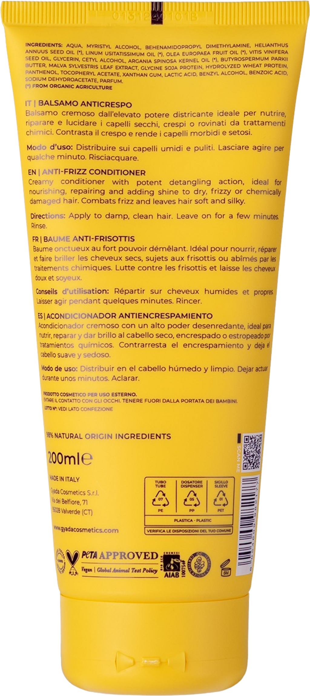 Anti-Frizz-balsam fra GYADA Cosmetics er en mild pleie for tørt, skadet og behandlet hår. Balsamen inneholder en blanding av planteoljer, sheasmør, malveekstrakt, og hydrolysert hvete- og soyaprotein. Den løsner floker, temmer, og har en reparerende og nærende virkning. Sammen hjelper ingrediensene med å gjenopprette mykhet og glans til håret.