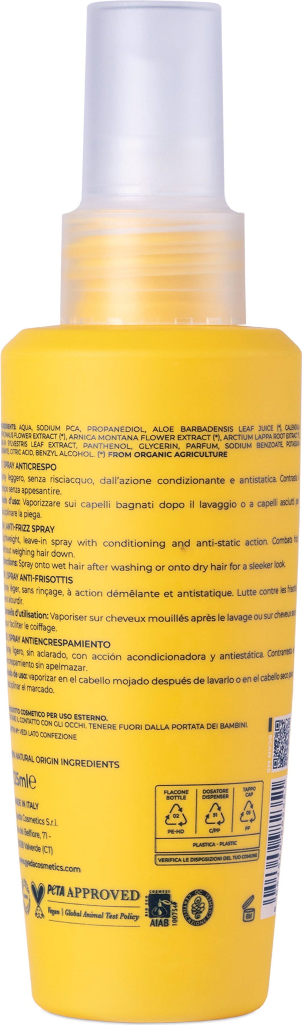 Takket være sin innovative, friske og lette formel er Anti-Frizz-Spray ideell for styling av behandlet, stresset og uregjerlig hår - uansett om det er glatt eller krøllet. Den inneholder en blanding av plantebaserte økologiske ekstrakter som virker antistatisk og pleiende, og som motvirker frizz uten å klisse eller tynge håret. I tillegg gir den en naturlig glans og beskytter håret mot eksterne påvirkninger.