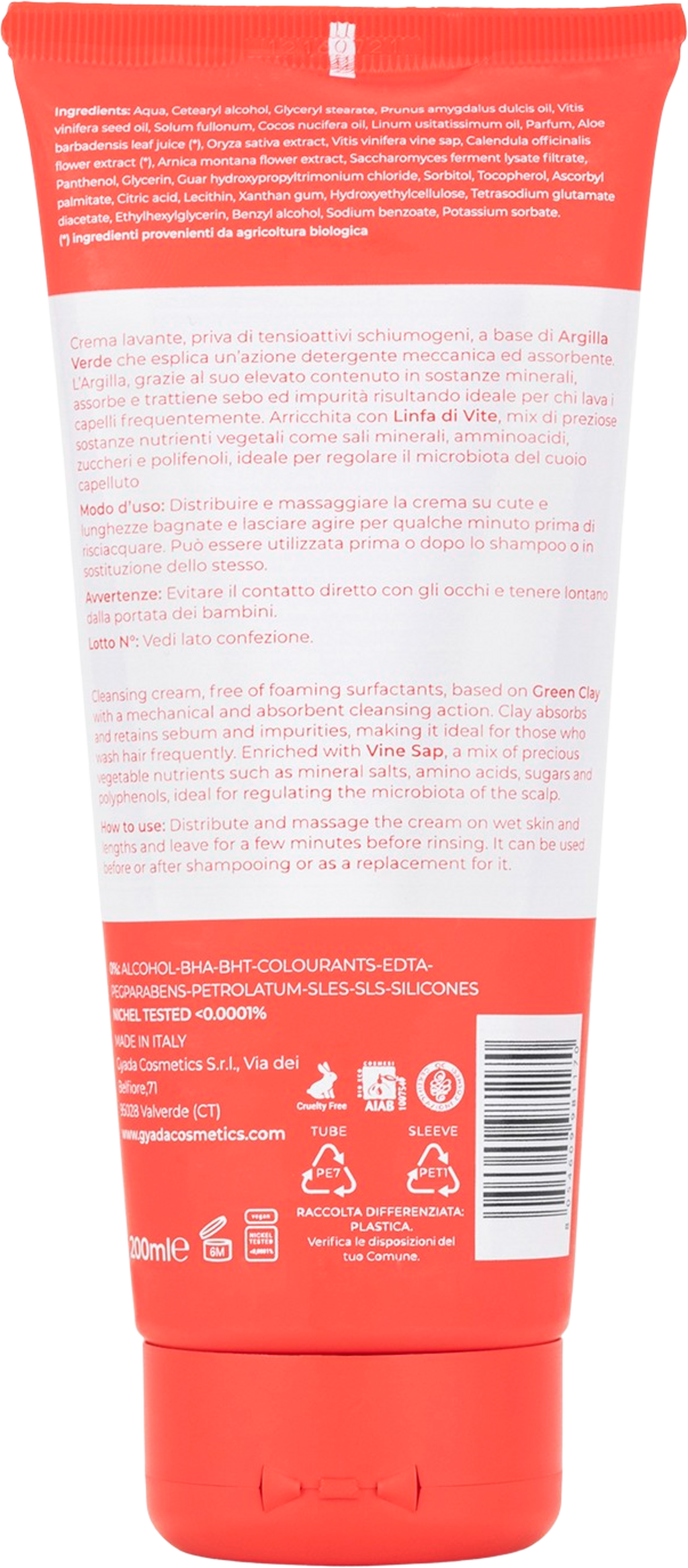 Denne hårreinigingskremen basert på grønn leire er fri for skummemidler og renser håret på en svært mild måte. Det høye mineralinnholdet binder overflødig sebum, noe som gjør den ideell for alle som vasker håret ofte. Formelen er i tillegg beriket med druesaft, mineraler, aminosyrer, sukker og polyfenoler, som er ideelle for å regulere hodebunnens mikrobiom, øke hårets elastisitet og forhindre håbruk. Fermentert risvann tilfører håret rikelig med fuktighet og reduserer dermed synlig det typiske krusete effekten ved krøller.