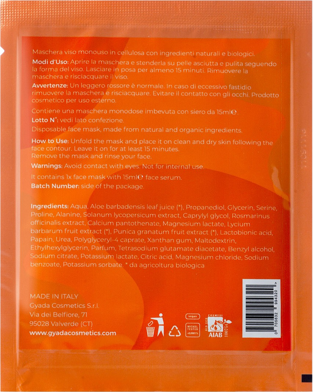 GYADA Cosmetics tilbyr med denne arkmasken en optimal, ukentlig pleie for å fjerne døde hudceller, overflødig smuss og smogrester. Den inneholder en plantebasert peelingkompleks med laktobionsyre, tomat, goji-bær samt granateple og sørger for en klarere, lysere hudfarge.