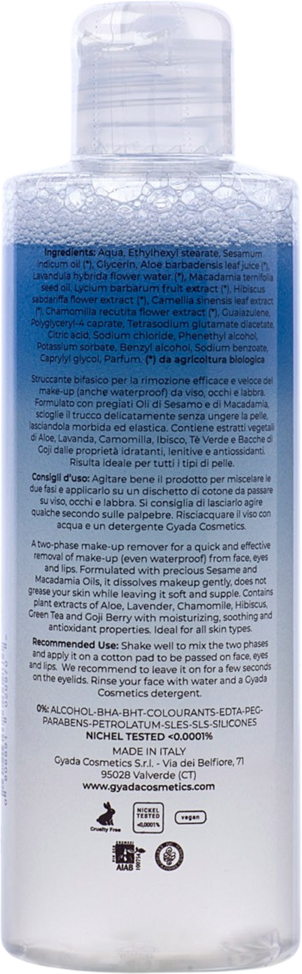 2-fase sminkefjerner fra GYADA Cosmetics er ideell for perfekt rens og fjerner selv vannfast sminke. Den virker raskt og effektivt på ansikt, øyne og lepper. Fine sesam- og macadamiaoljer fjerner sminken skånsomt uten å klebe og etterlater huden myk og smidig! Videre inneholder den planteekstrakter fra aloe, lavendel, hibiskus, kamille, grønn te og goji-bær, som virker beroligende, antioksidant og oppstrammende. Et friskt og delikat produkt, ideelt for daglig bruk på alle hudtyper.