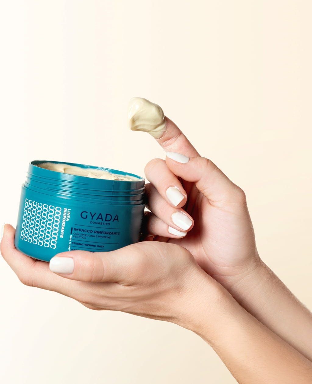 Denne hårmasken fra GYADA Cosmetics er et aktivstoffkonsentrat for remineralisering og vitalisering av skjørt, stresset og tynnende hår. Den gir styrke tilbake, styrker og polerer hårfibern, og kan motvirke utviklingen av flisete tupper. Produktet inneholder en konsentrert booster fra plantebaserte ingredienser som spirulina (alger rik på vitaminer, aminosyrer og mineralsalter), havre, ginseng, kjerringrokk, hvete- og soyaproteiner, samt aloe vera og planteoljer.