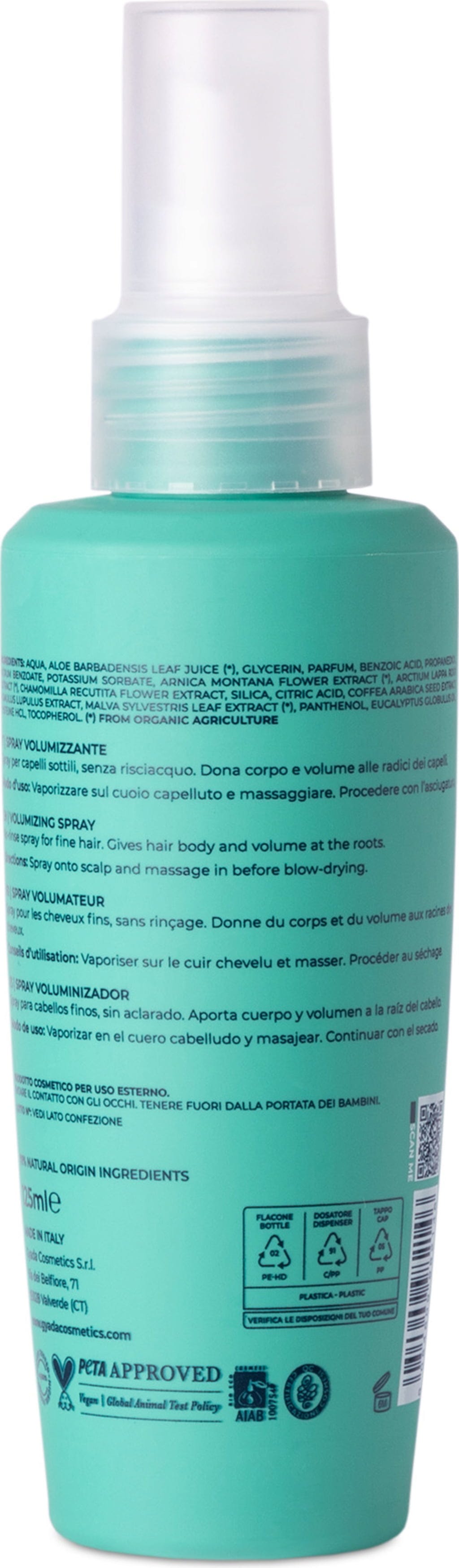 Volum Spray er ideell for å gi volum til tynt og rett hår som mister fylde rett etter tørking. Formuleringen med økologiske plantebaserte ingredienser, som aloe vera, kamille, humle, borre og kattost, bidrar til å gi fylde ved hårrøttene og fikserer stylingen.