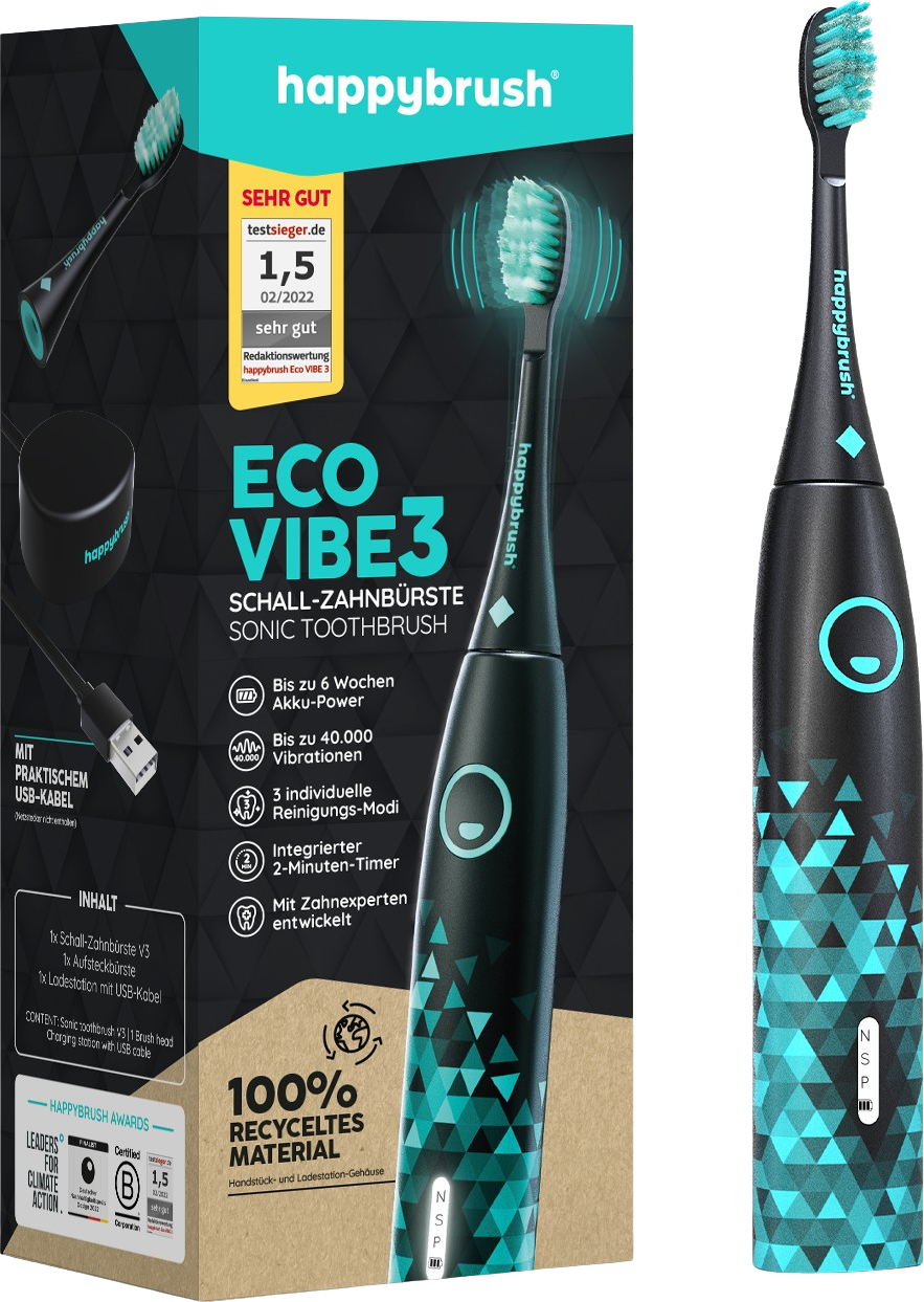 Den bærekraftige soniske tannbørsten ECO VIBE 3 fra happybrush optimaliserer din tannpleie og gjør samtidig miljøet glad. De innovative triple-bustene rengjør tennene grundig og masserer tannkjøttet. Den integrerte 2-minutters timeren gir deg en ideell oversikt over pusse tiden, mens de 3 forskjellige rengjøringsmodusene tilpasses dine individuelle behov. Det kraftige Power-batteriet gir tannbørsten energi i opptil 6 uker.