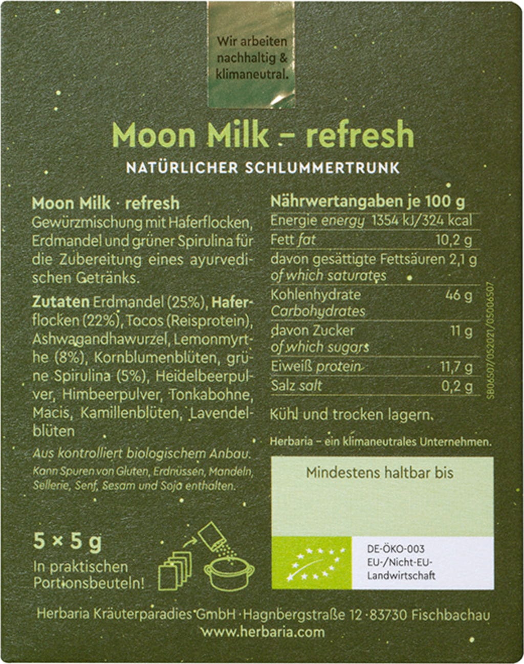 Unn deg en Moon Milk "refresh" for å slappe av etter en stressende dag. Enten den er varm eller kald - den ayurvediske blandingen med ashwagandha, lavendel, jordmandel og havreflak støtter deg. Sitronmyrt gir den friske smaken mens spirulina gir Moon Milk den lysegrønne fargen - helt uten kunstige fargestoffer!