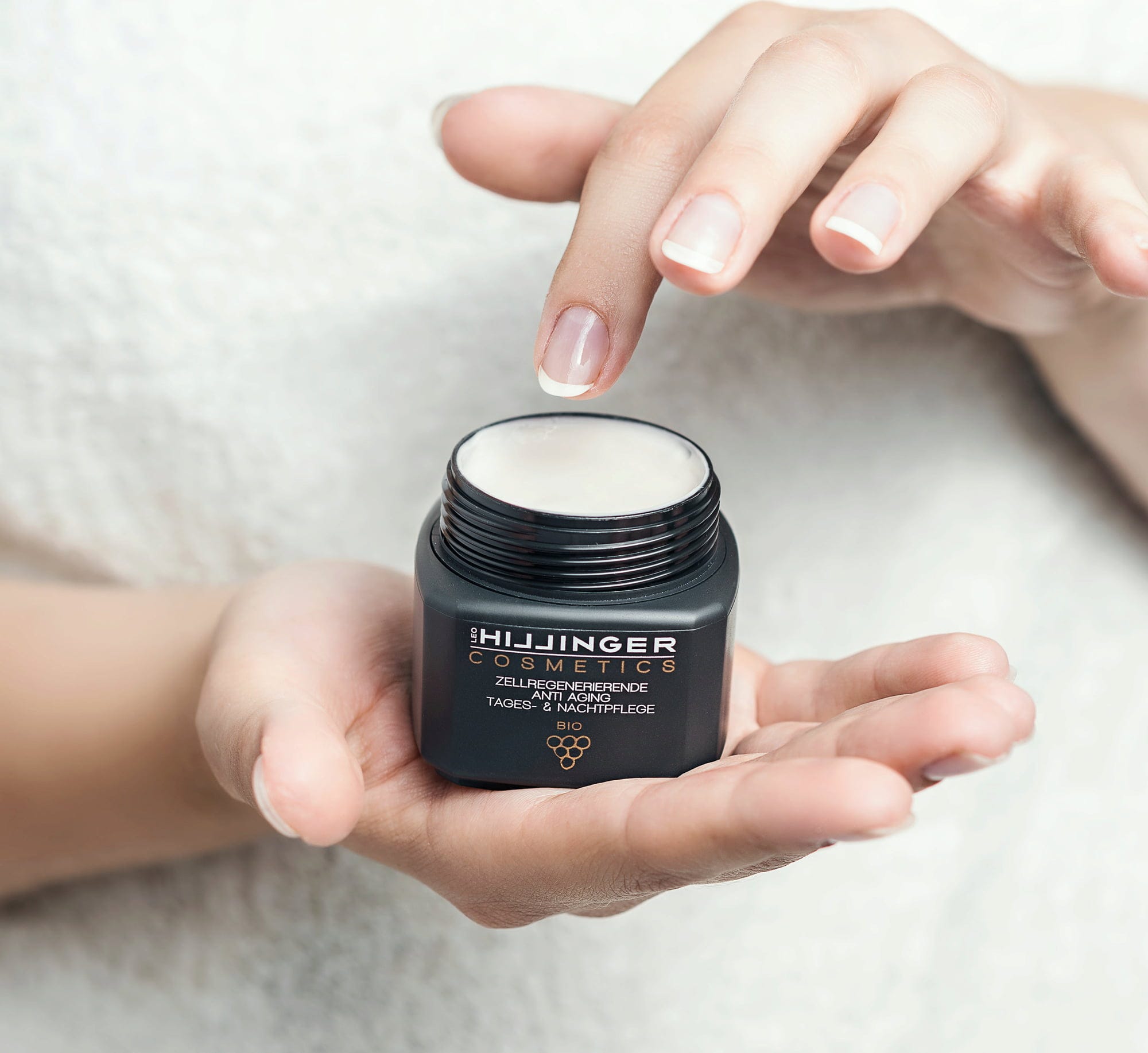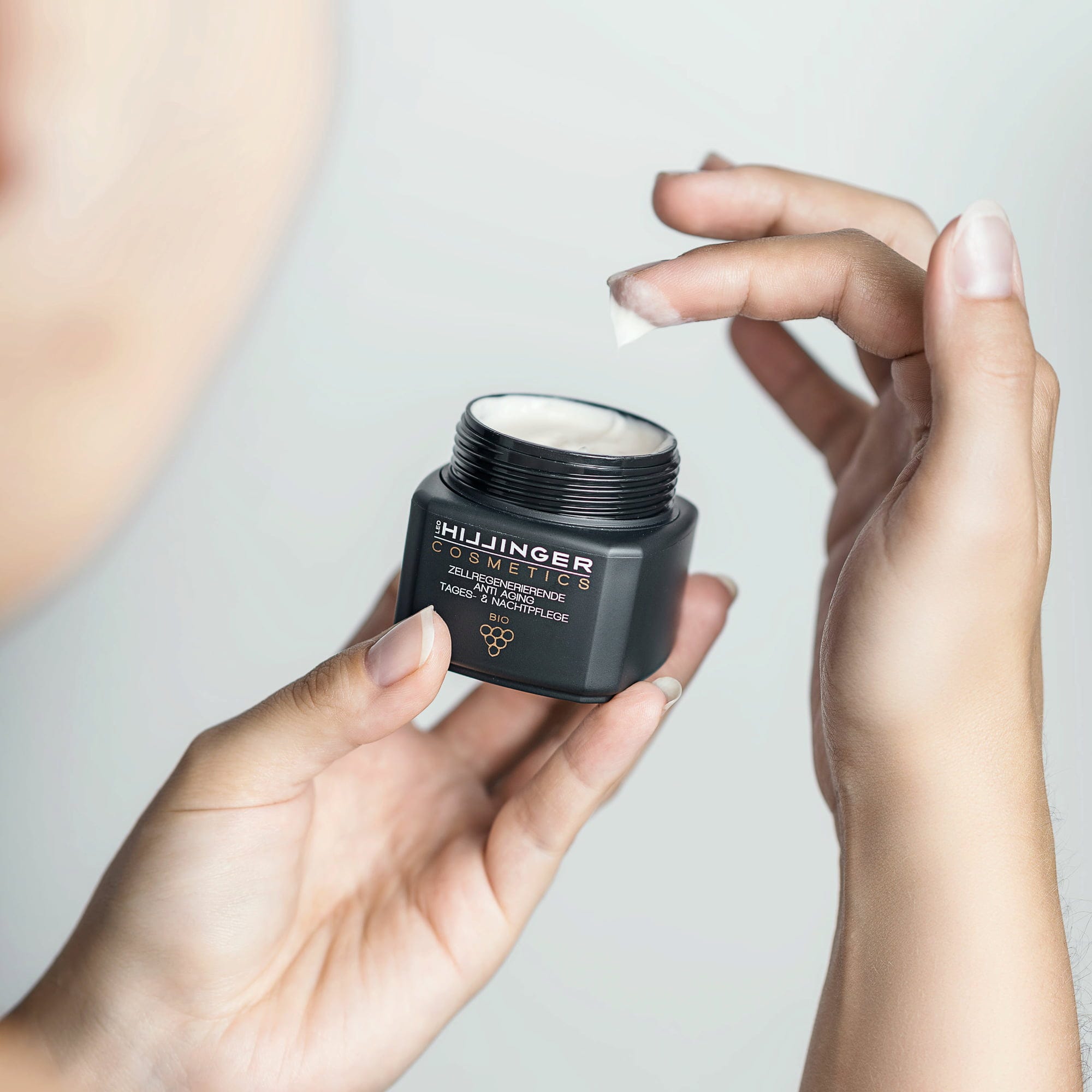 Med dag- og nattkremen fra HILLINGER COSMETICS har du den konsentrerte pleiekraften fra vinmarken i dine hender. Formuleringen inneholder vann, kjernekjernerolje og kjernekstrakt fra økologiske druer, som har et spesielt høyt innhold av antioksidanter. I tillegg er ekstrakter fra vinranker og drueknopper rike på resveratrol, en polyfenol som er en virkelig anti-aldringsingrediens.