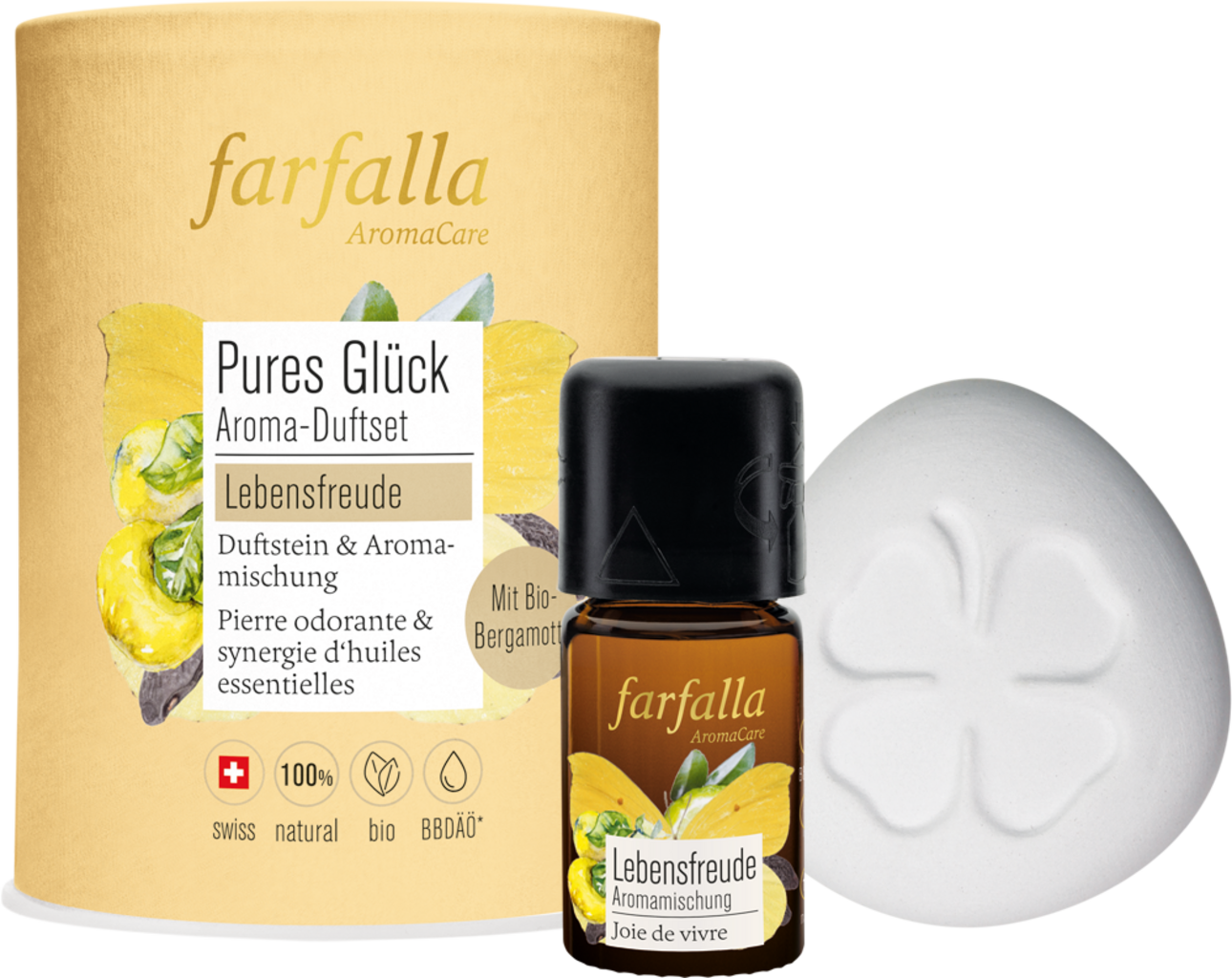Dette settet er som en solstråle for sjelen din – varm og full av letthet. Aromablandingen kombinerer fruktige og blomsteraktige noter fra 100 % rene, naturlige essensielle oljer som bergamott, geranium, osmanthus og andre dyrebare essenser. Duften inspirerer og gir deg øyeblikk med glede. Den vakre duftsteinen blander seg stilig inn i ethvert miljø og frigjør subtilt duften sin til omgivelsene.
