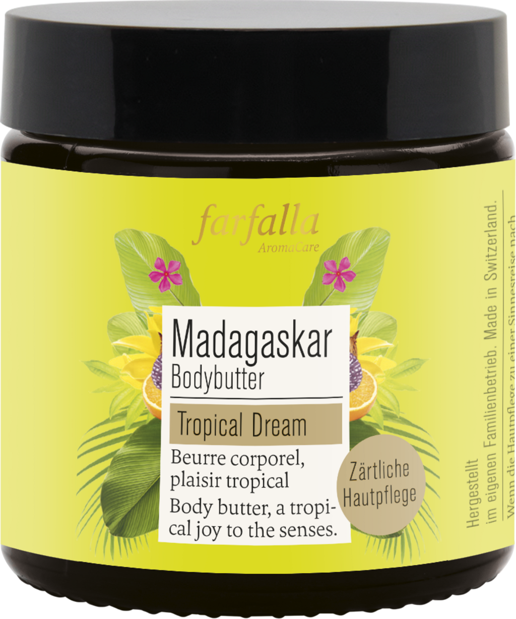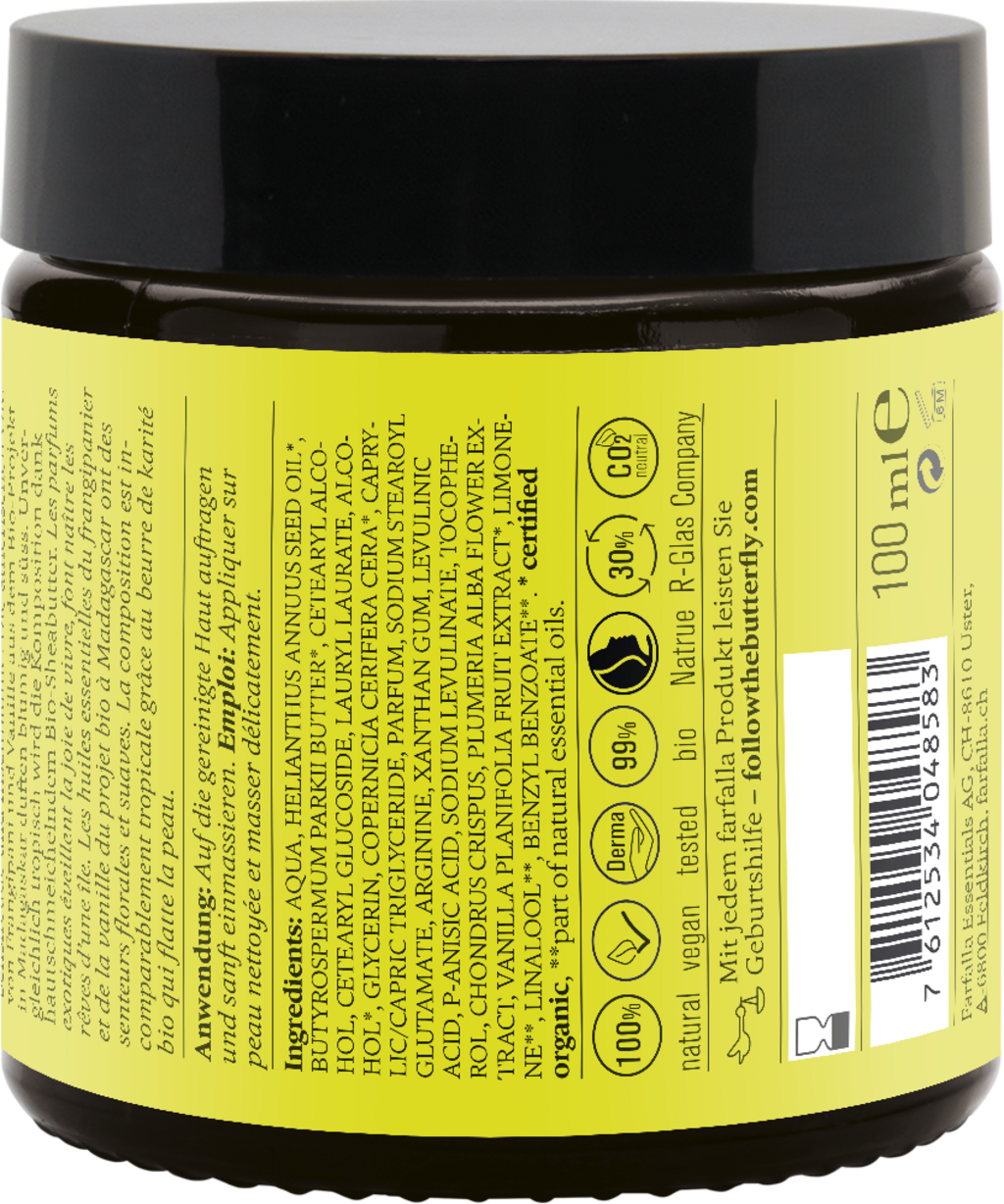 Basert på økologisk sheasmør tar kroppshudpleien fra farfalla deg med inn i en fantastisk forførende verden. Den ytterst milde og fuktighetsgivende formelen til kroppssmøret omslutter kroppen din med ett kjærlig lag som gir en følelse av mykhet og smidighet. Den sanselige reisen forfører også nesen din med en eksotisk fruktig-blomstrende duft.