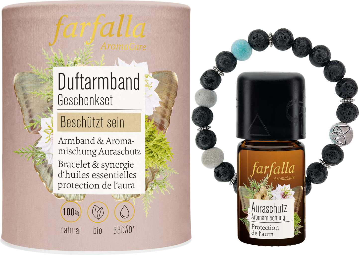Dette vakre settet er den perfekte gave for alle som er opptatt av beskyttelse og klarhet. Det inkluderer Aromablandingen Auraschutz og et vakkert armbånd med lava- og tekstilperler. Duftblandingen av røkelse, angelica, bergamott, neroli og geranium står for beskyttelse, rensning og klarhet. Lavaperlene er fargekoordinert og gjør armbåndet til et blikkfang, hvis duftende hemmelighet kun bæres av brukeren selv. Armbåndet er utstyrt med et strikk - uten ekstra lås - med en lengde på ca. 18 cm.