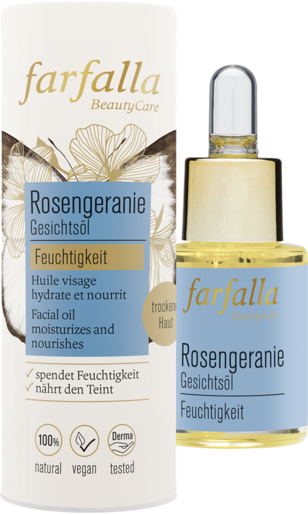 Denne nærende oljen med rosegeranium er en ideell fuktighetsgiver for tørr ansiktshud. Med sine nærende egenskaper er den også perfekt for arrpleie, da hudcellene støttes optimalt i sin regenerering. I tillegg har ansiktsoljen en toniserende effekt og gir en smidig hudfølelse.