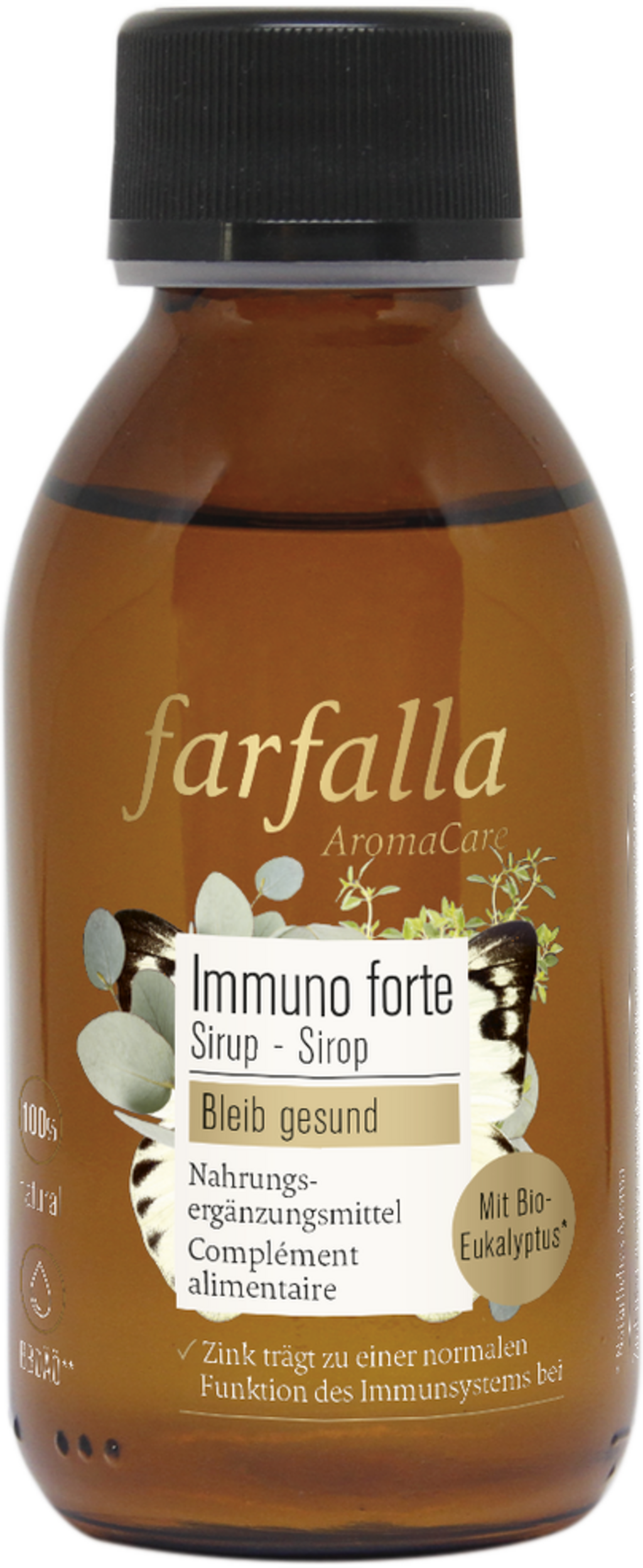 Immuno Forte Sirup fra farfalla inneholder sink, propolis og andre verdifulle planteekstrakter, som spesielt i den kalde årstiden gjerne kommer til anvendelse.