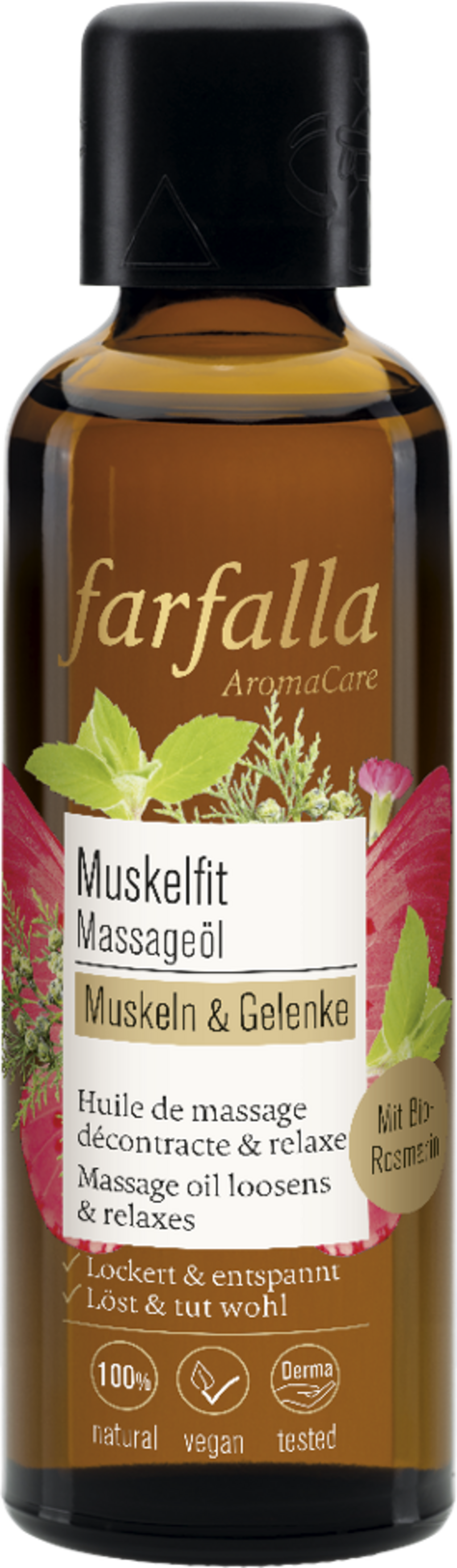 Den verdifulle formelen til oljen fra farfalla støtter regenereringsprosessen etter fysisk aktivitet optimalt og gir en behagelig hudfølelse. En blanding av eteriske oljer fra rosmarin, kamfer, merian og lavandin kombinert med økologisk arnikaolje gir det perfekte grunnlaget for en herlig massasje. Teksturen trekker raskt inn og etterlater huden myk.