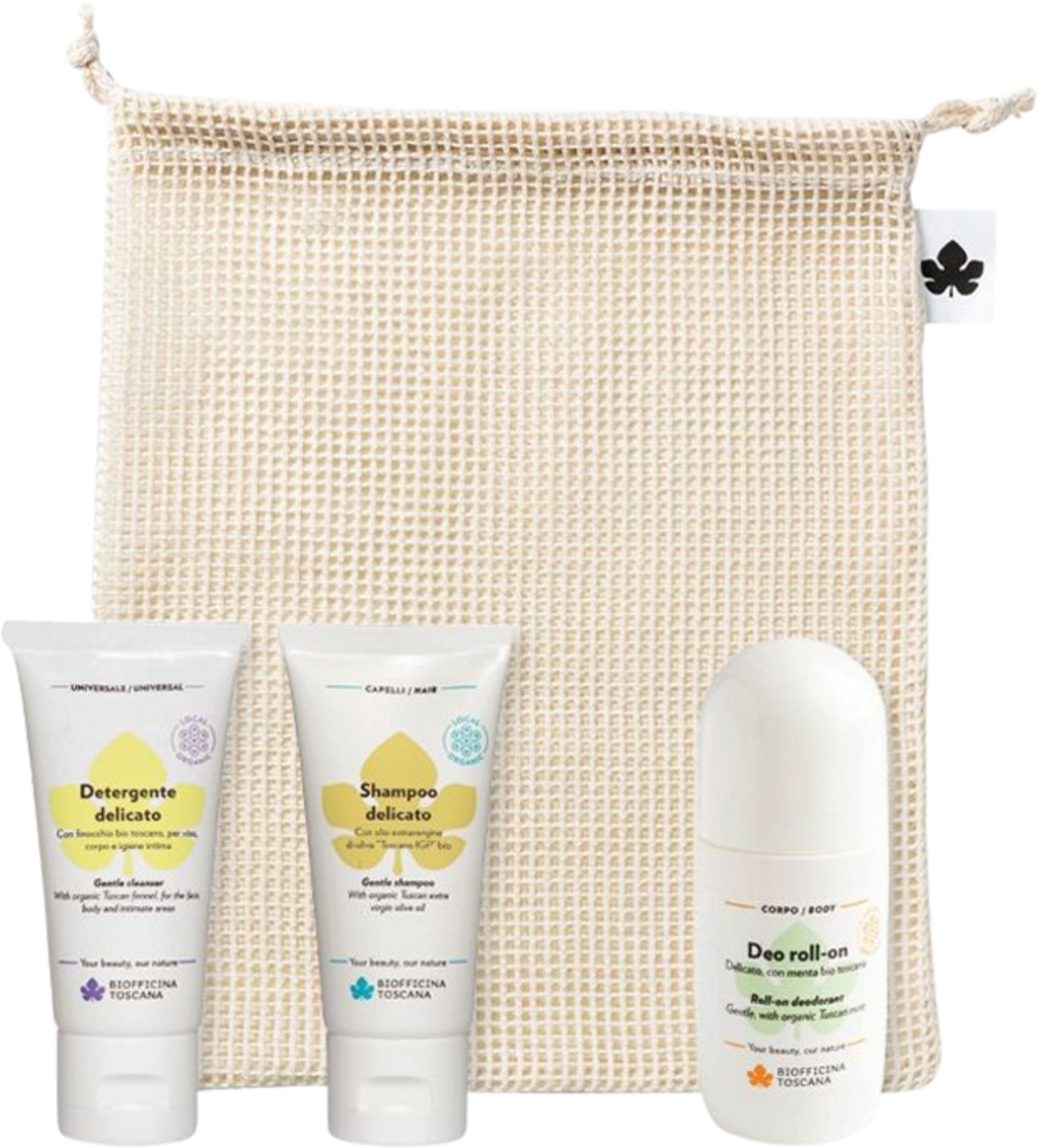 Dette settet inneholder de mest populære produktene fra merket og er i et format som er ideelt for reiser. Det består av små størrelser av en mild rengjører, en skånsom sjampo og en original størrelse deodorant. De tre produktene er pakket i en transparent nettingpose av bomullsmesh.